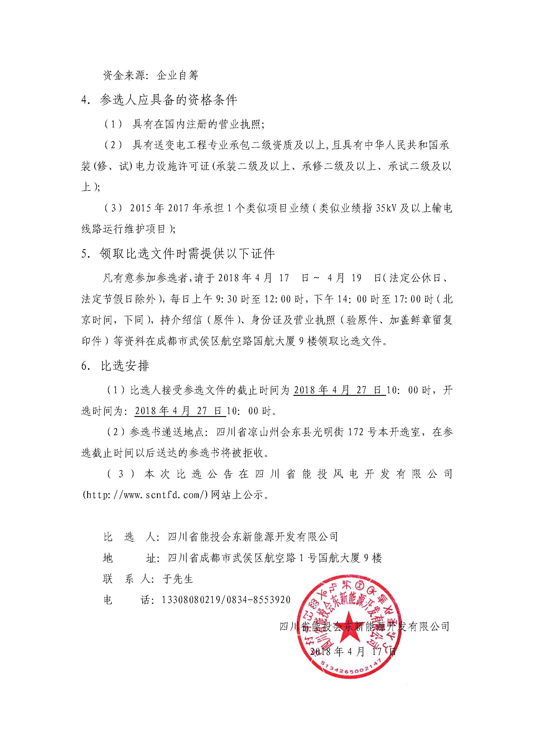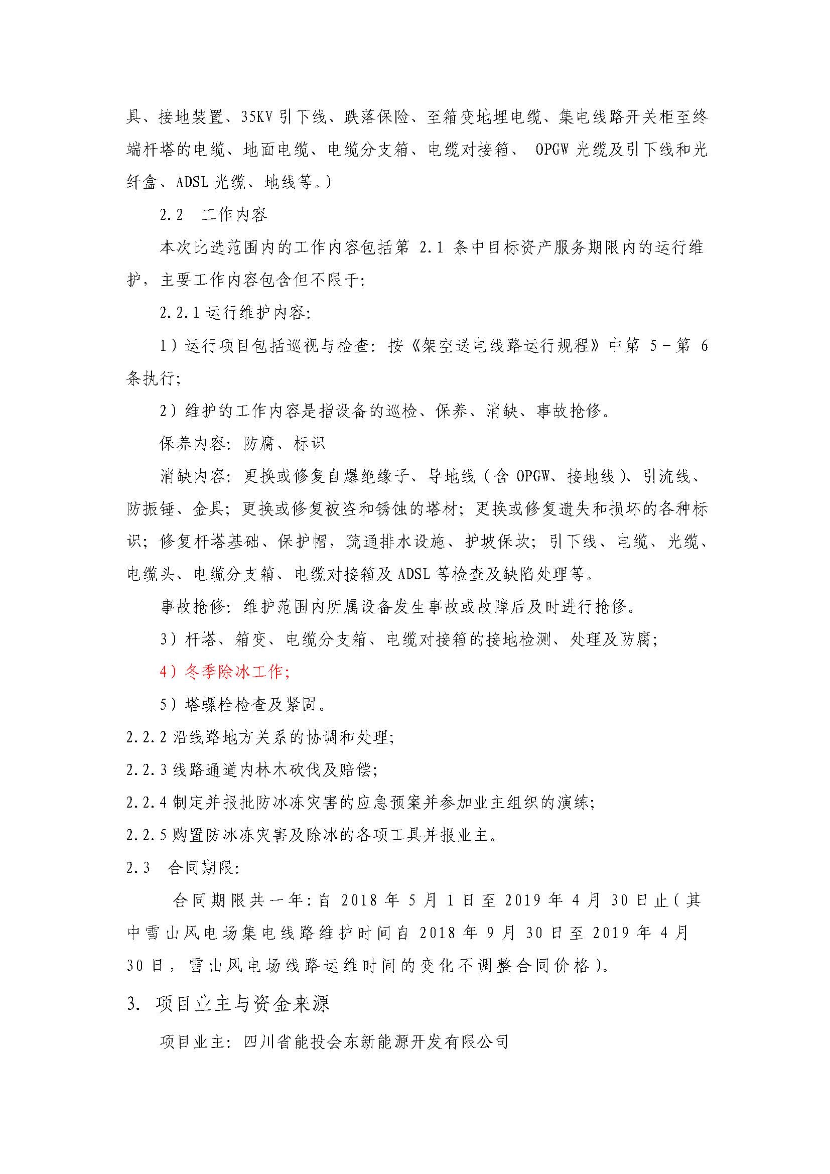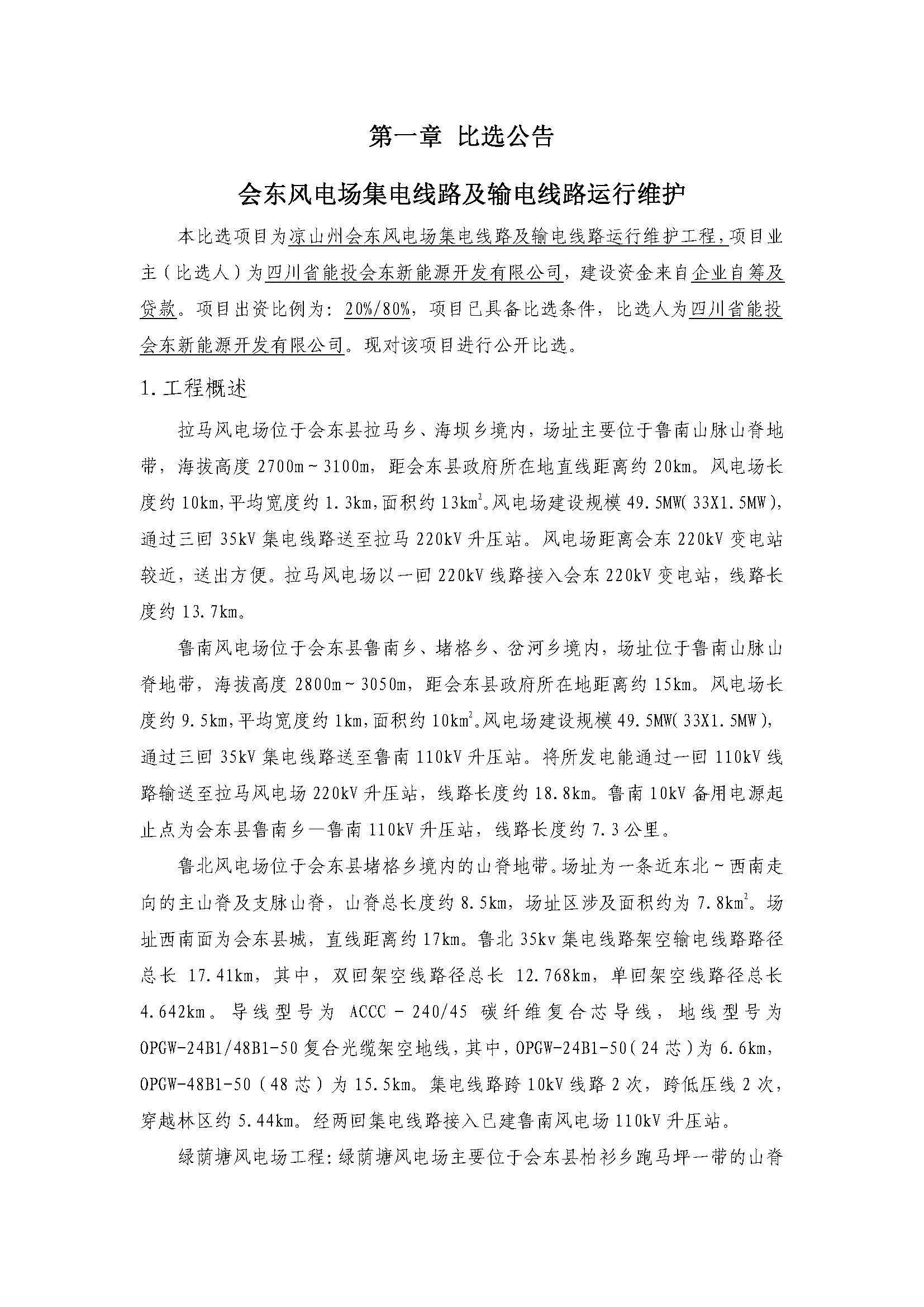 本比选项目为凉山州会东风电场集电线路及输电线路运行维护工程,项目业主(比选人)为四川省能投会东新能源开发有限公司,建设资金来自企业自筹及贷款。项目出资比例为:20%/80%,项目已具备比选条件,比选人为四川省能投会东新能源开发有限公司。现对该项目进行公开比选。