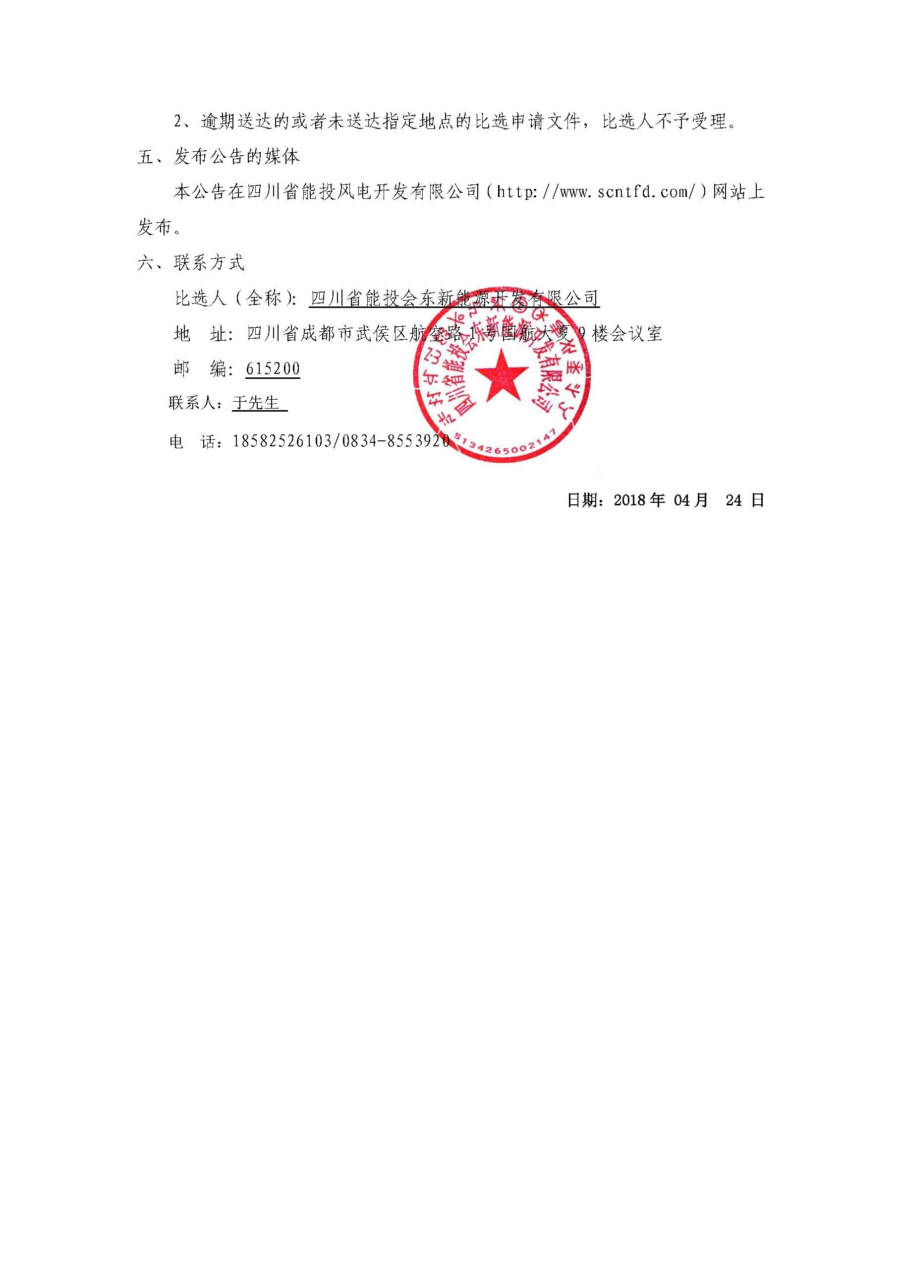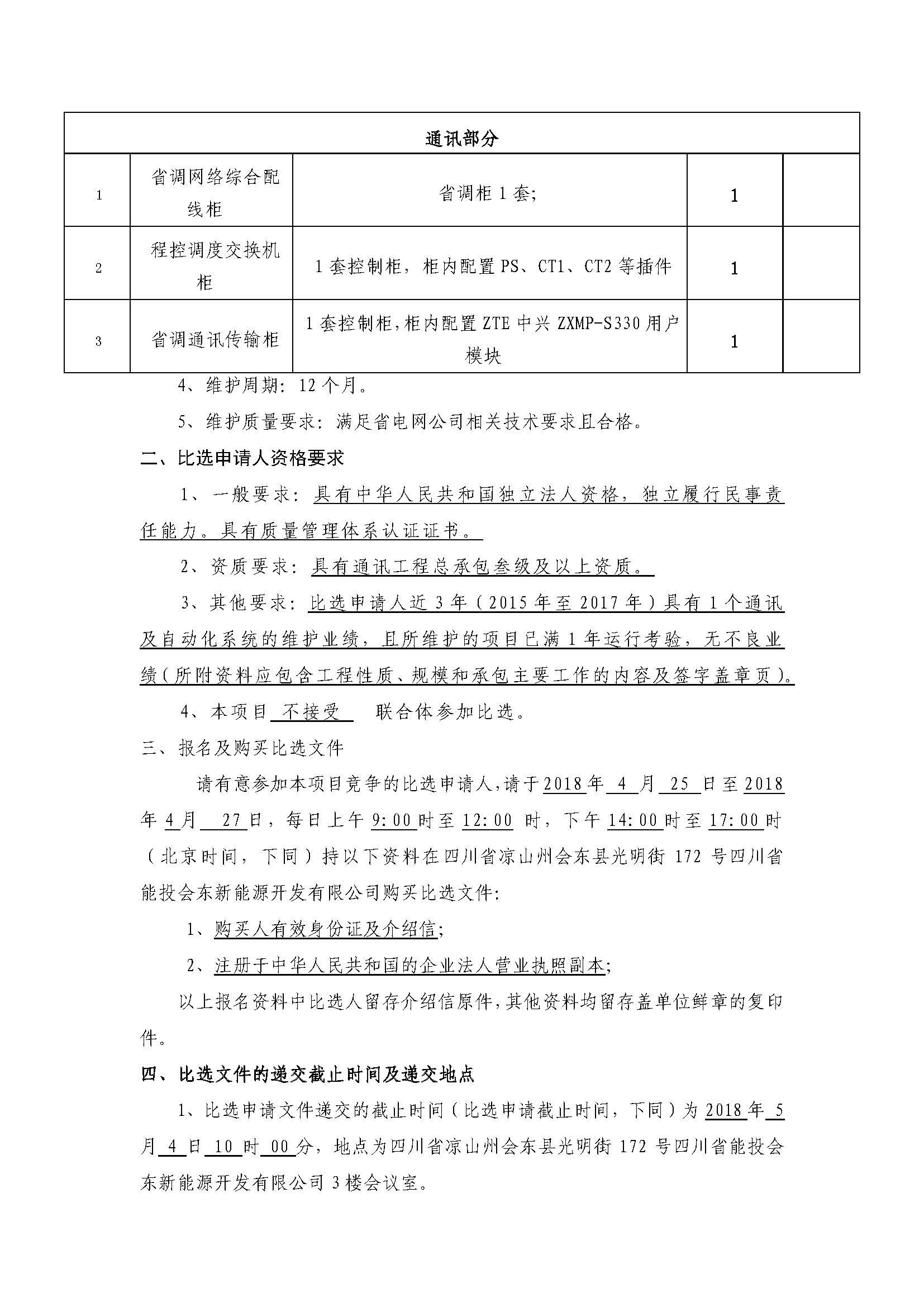 1、比选申请文件递交的截止时间(比选申请截止时间,下同)为2018年 5 月 4 日 10 时 00分,地点为四川省凉山州会东县光明街172号四川省能投会东新能源开发有限公司3楼会议室。