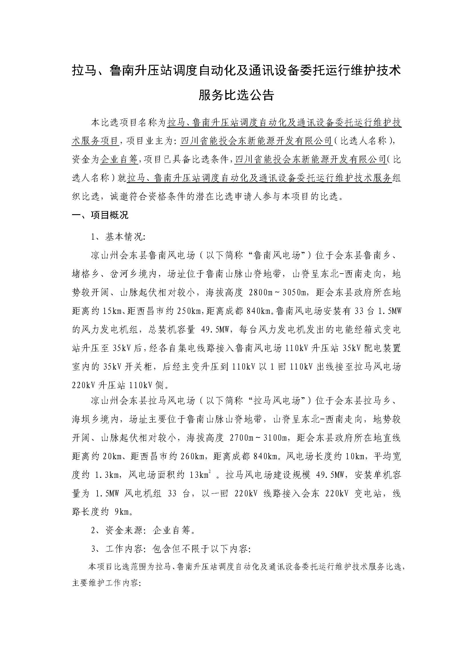 本比选项目名称为拉马、鲁南升压站调度自动化及通讯设备委托运行维护技术服务项目,项目业主为:四川省能投会东新能源开发有限公司(比选人名称),资金为企业自筹,项目已具备比选条件,四川省能投会东新能源开发有限公司(比选人名称)就拉马、鲁南升压站调度自动化及通讯设备委托运行维护技术服务组织比选,诚邀符合资格条件的潜在比选申请人参与本项目的比选。