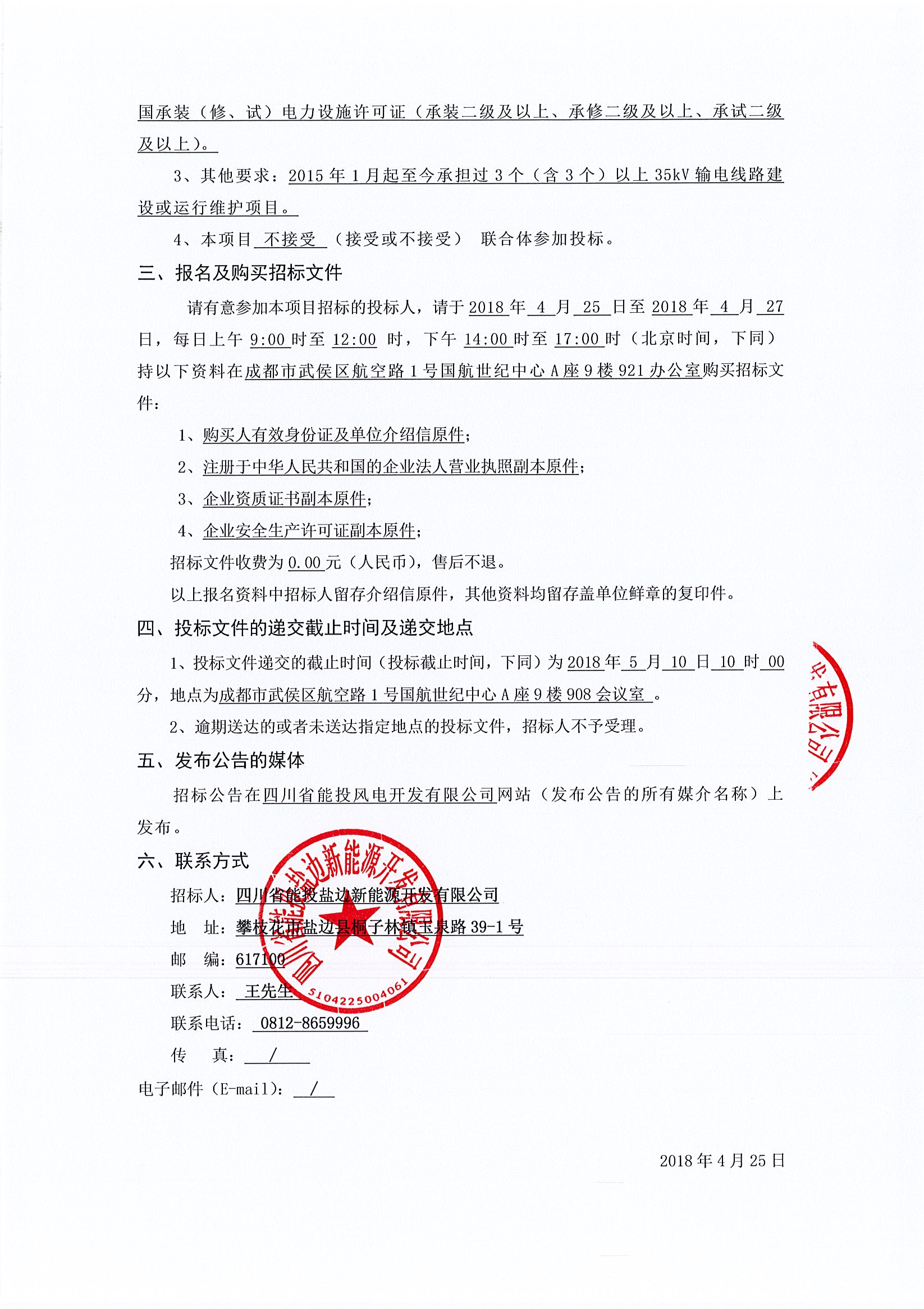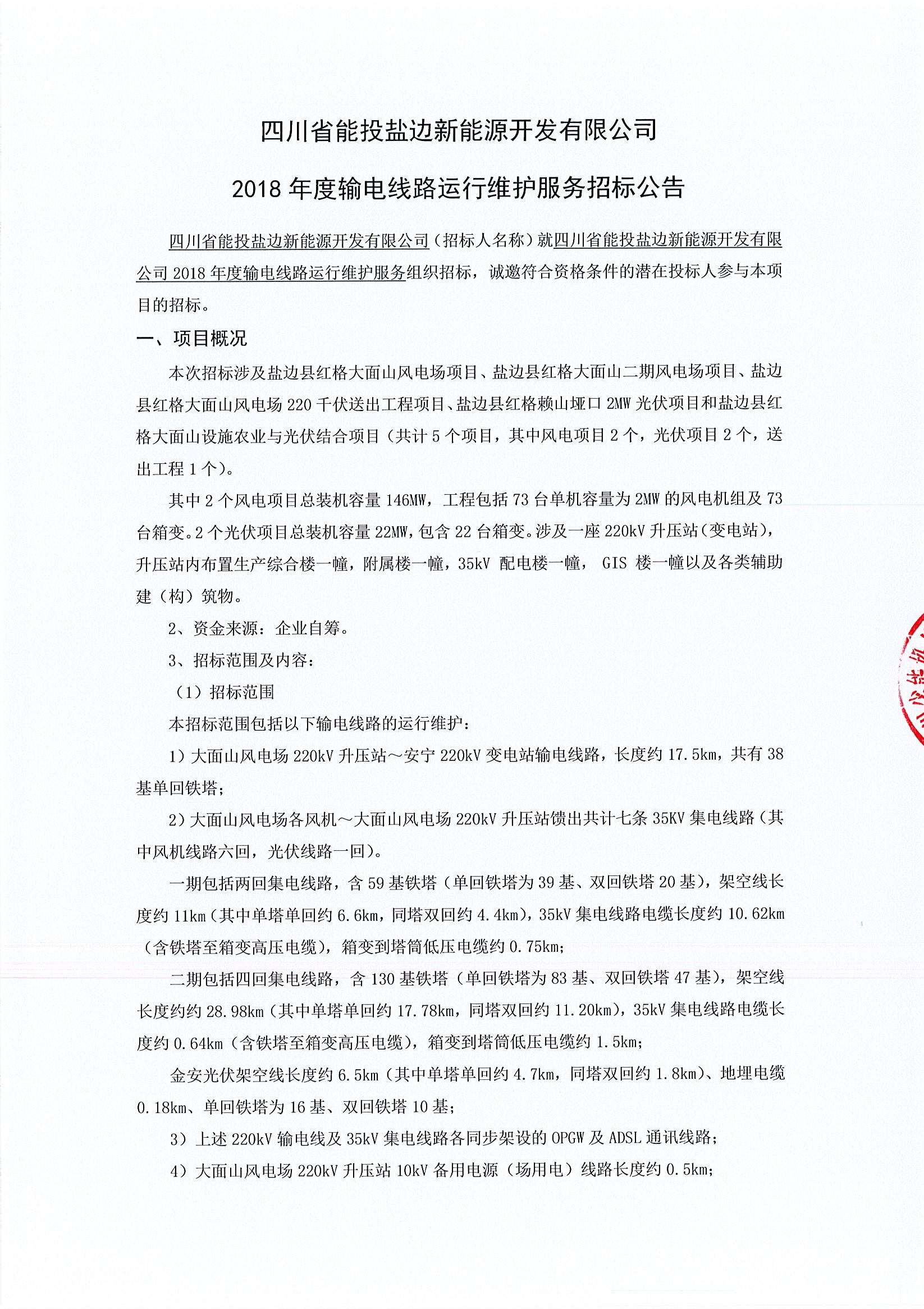 四川省能投盐边新能源开发有限公司(招标人名称)就四川省能投盐边新能源开发有限公司2018年度输电线路运行维护服务组织招标,诚邀符合资格条件的潜在投标人参与本项目的招标。