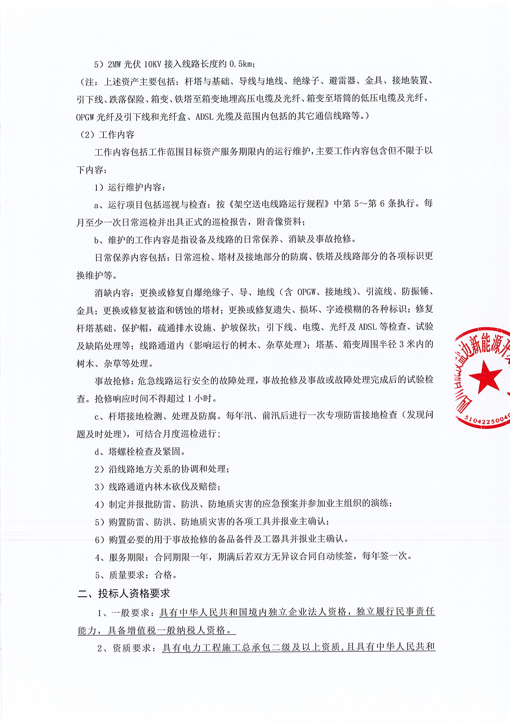 2、资质要求:具有电力工程施工总承包二级及以上资质,且具有中华人民共和国承装(修、试)电力设施许可证(承装二级及以上、承修二级及以上、承试二级及以上)。