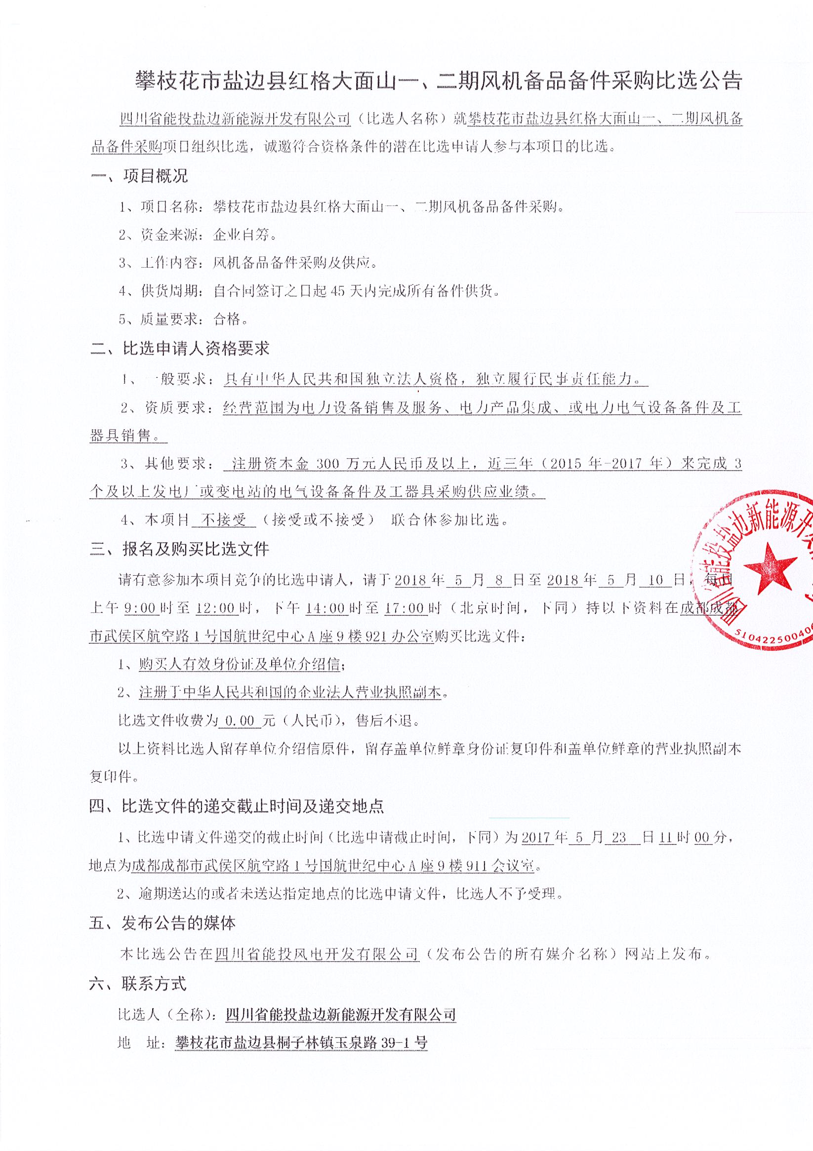 四川省能投盐边新能源开发有限公司(比选人名称)就攀枝花市盐边县红格大面山一、二期风机备品备件采购项目组织比选,诚邀符合资格条件的潜在比选申请人参与本项目的比选。