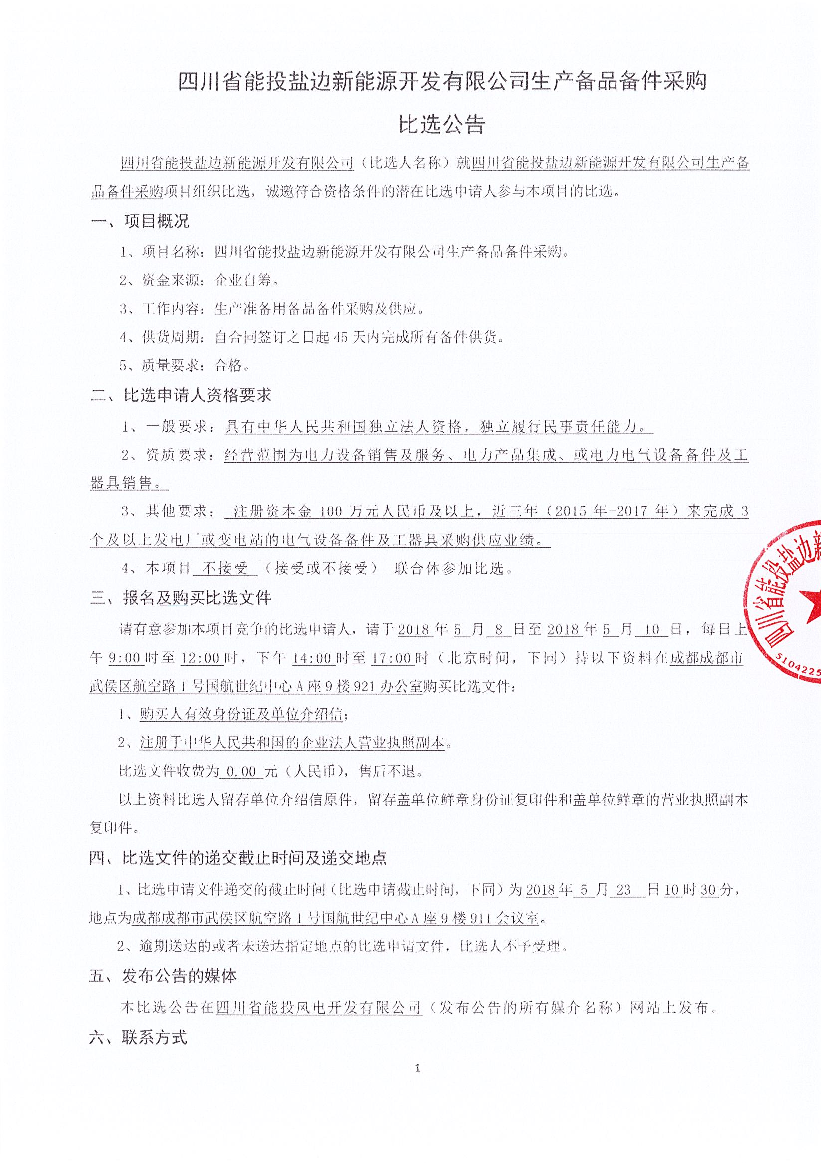 1、项目名称:四川省能投盐边新能源开发有限公司生产备品备件采购。