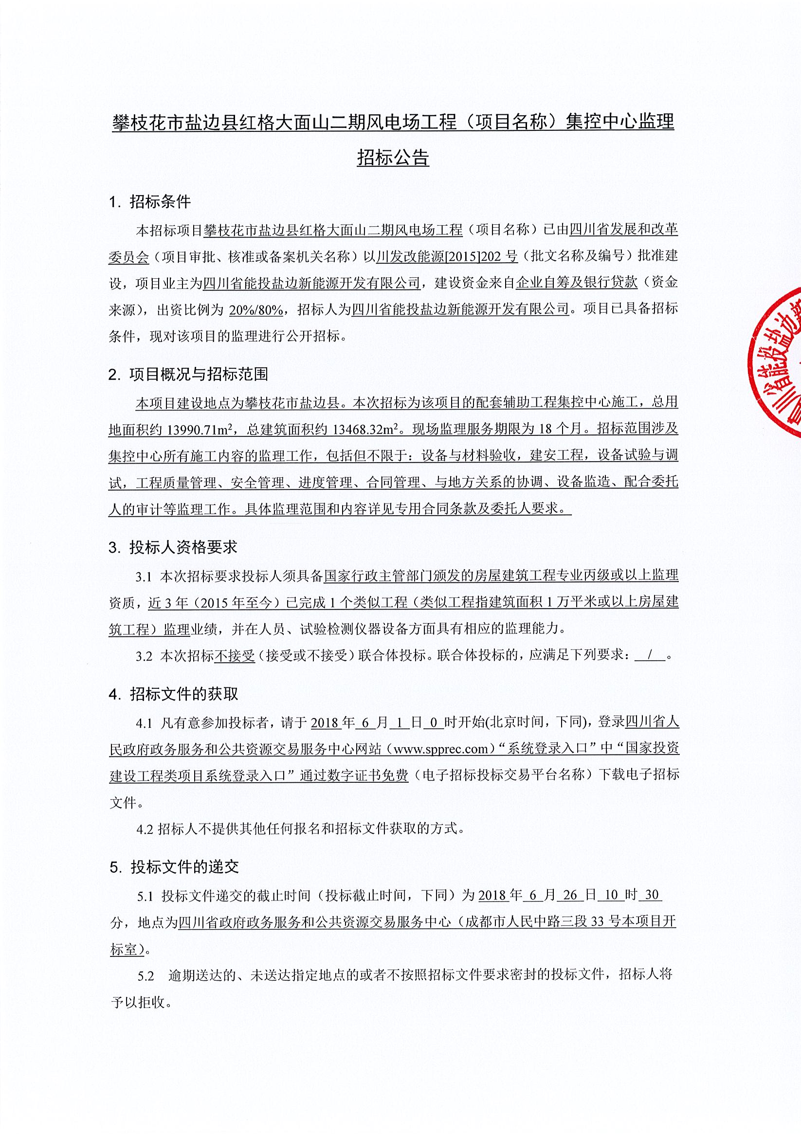 本招标项目攀枝花市盐边县红格大面山二期风电场工程(项目名称)已由四川省发展和改革委员会(项目审批、核准或备案机关名称)以川发改能源[2015]202号(批文名称及编号)批准建设,项目业主为四川省能投盐边新能源开发有限公司,建设资金来自企业自筹及银行贷款(资金来源),出资比例为20%/80%,招标人为四川省能投盐边新能源开发有限公司。项目已具备招标条件,现对该项目的监理进行公开招标。
