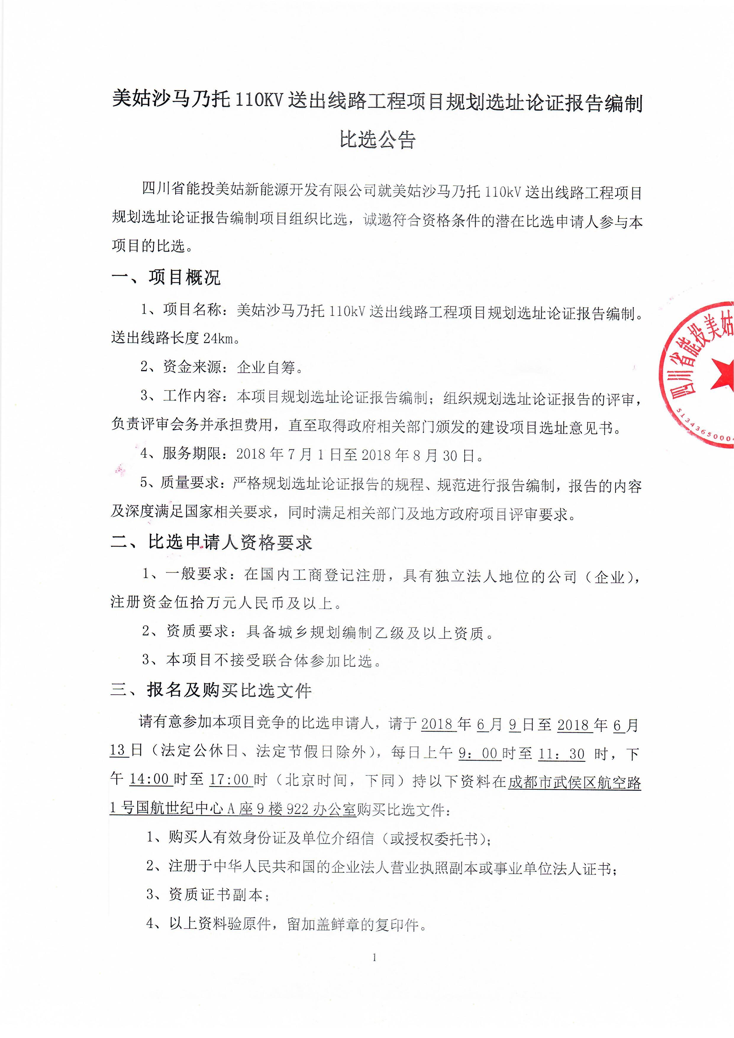 四川省能投美姑新能源开发有限公司就美姑沙马乃托110kV送出线路工程项目规划选址论证报告编制项目组织比选,诚邀符合资格条件的潜在比选申请人参与本项目的比选。