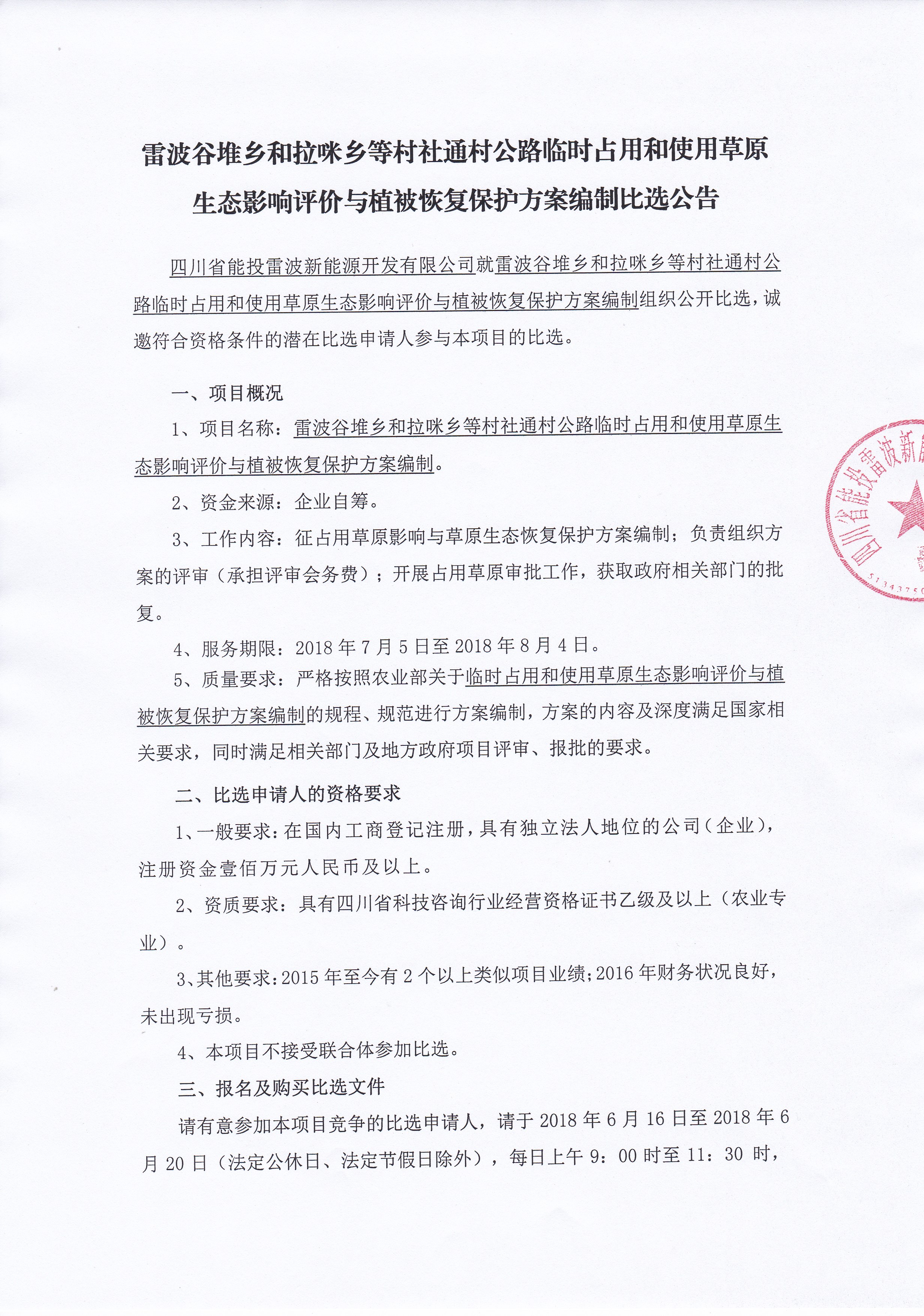 四川省能投雷波新能源开发有限公司就雷波谷堆乡和拉咪乡等村社通村公路临时占用和使用草原生态影响评价与植被恢复保护方案编制组织公开比选,诚邀符合资格条件的潜在比选申请人参与本项目的比选。