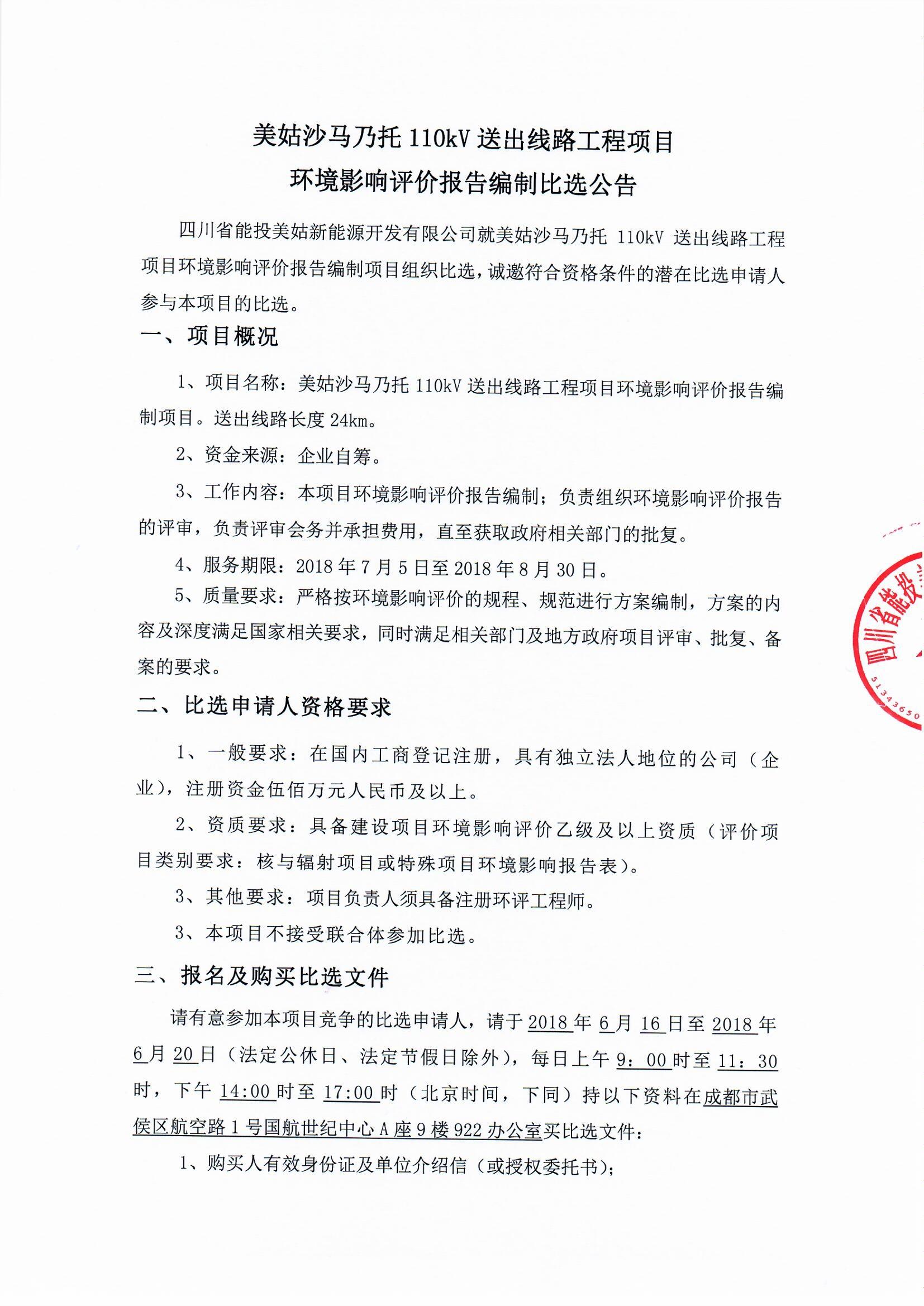 四川省能投美姑新能源开发有限公司就美姑沙马乃托110kV送出线路工程项目环境影响评价报告编制项目组织比选,诚邀符合资格条件的潜在比选申请人参与本项目的比选。