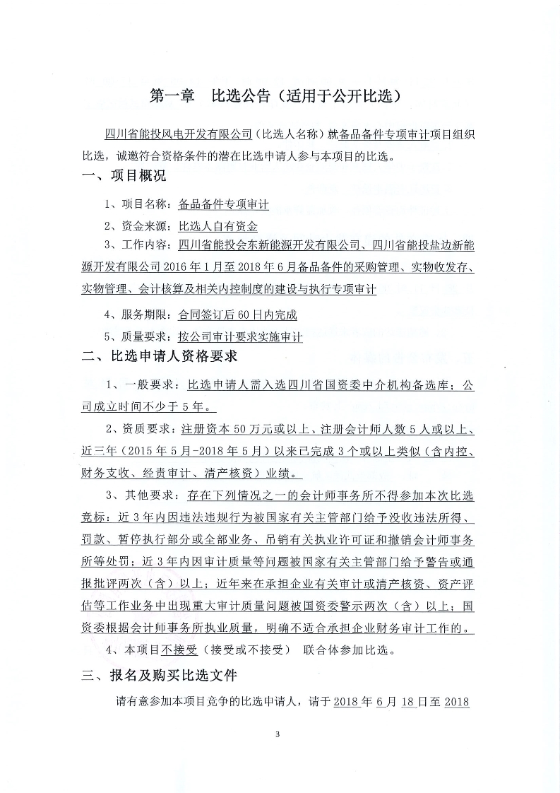 3、工作内容:四川省能投会东新能源开发有限公司、四川省能投盐边新能源开发有限公司2016年1月至2018年6月备品备件的采购管理、实物收发存、实物管理、会计核算及相关内控制度的建设与执行专项审计