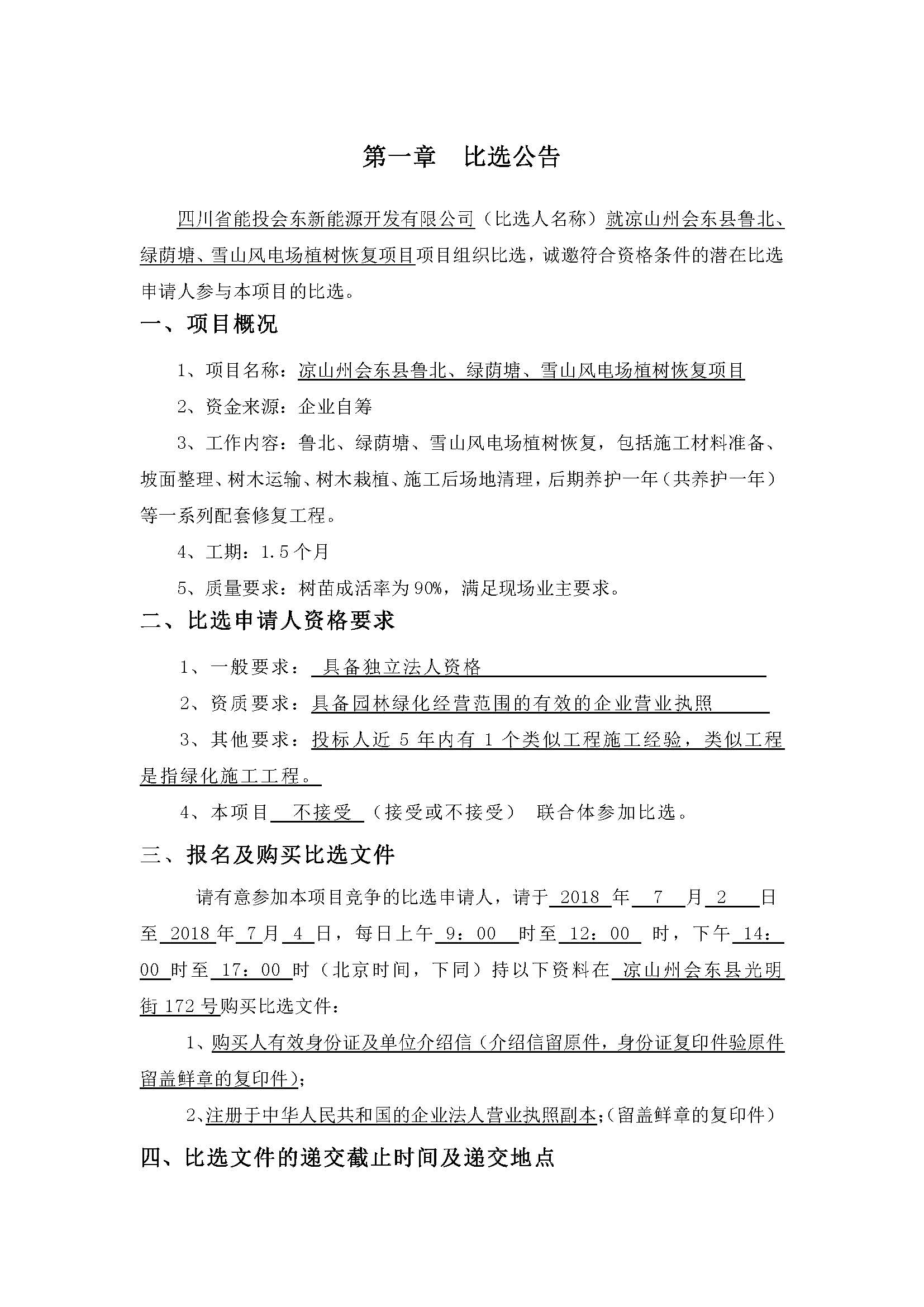 四川省能投会东新能源开发有限公司(比选人名称)就凉山州会东县鲁北、绿荫塘、雪山风电场植树恢复项目项目组织比选,诚邀符合资格条件的潜在比选申请人参与本项目的比选。