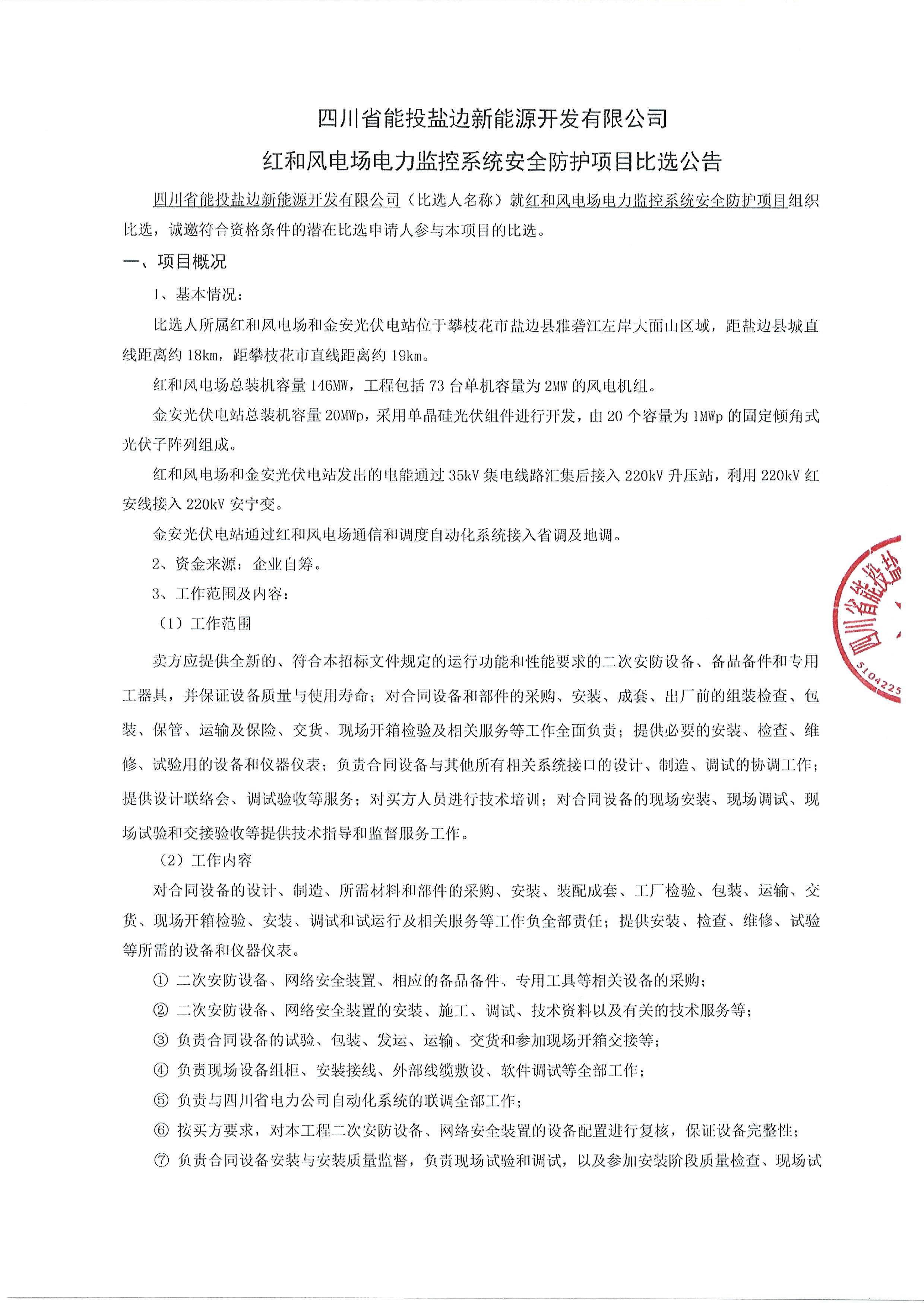 四川省能投盐边新能源开发有限公司(比选人名称)就红和风电场电力监控系统安全防护项目组织比选,诚邀符合资格条件的潜在比选申请人参与本项目的比选。