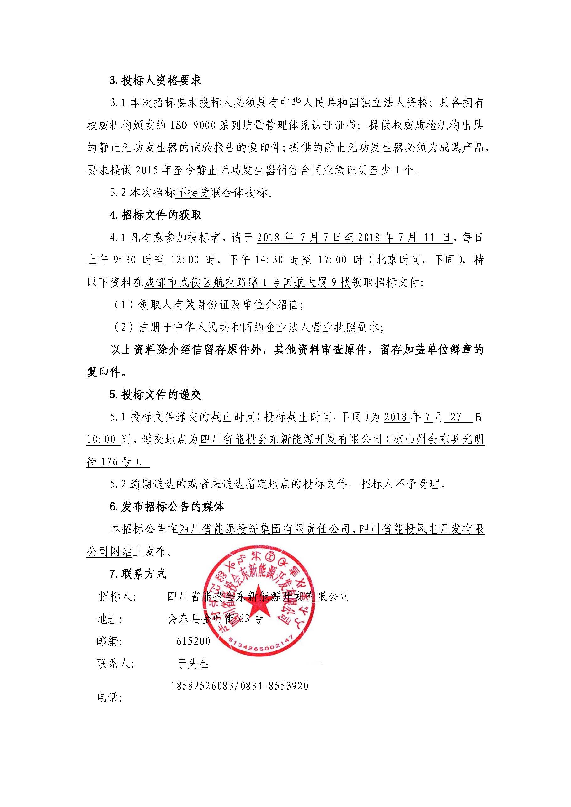 3.1本次招标要求投标人必须具有中华人民共和国独立法人资格;具备拥有权威机构颁发的ISO-9000系列质量管理体系认证证书;提供权威质检机构出具的静止无功发生器的试验报告的复印件;提供的静止无功发生器必须为成熟产品,要求提供2015年至今静止无功发生器销售合同业绩证明至少1个。