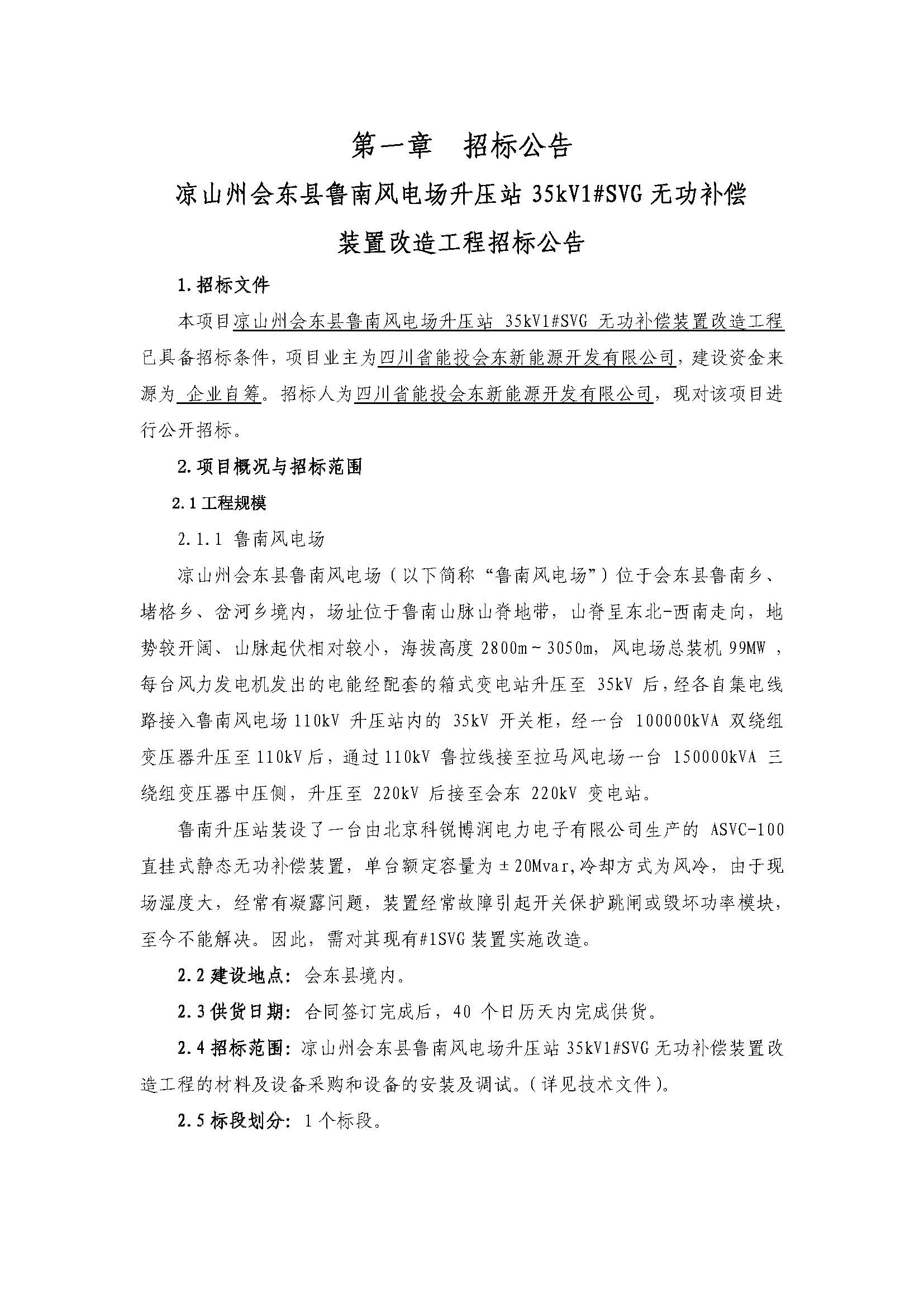 2.4招标范围:凉山州会东县鲁南风电场升压站35kV1#SVG无功补偿装置改造工程的材料及设备采购和设备的安装及调试。(详见技术文件)。