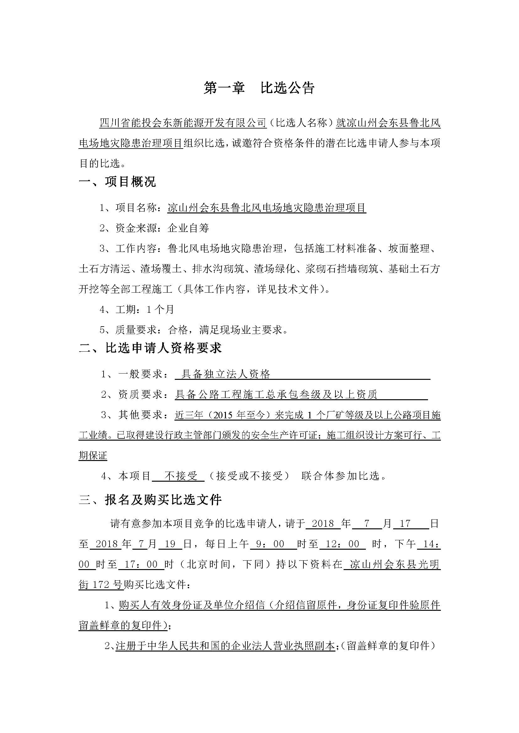 四川省能投会东新能源开发有限公司(比选人名称)就凉山州会东县鲁北风电场地灾隐患治理项目组织比选,诚邀符合资格条件的潜在比选申请人参与本项目的比选。
