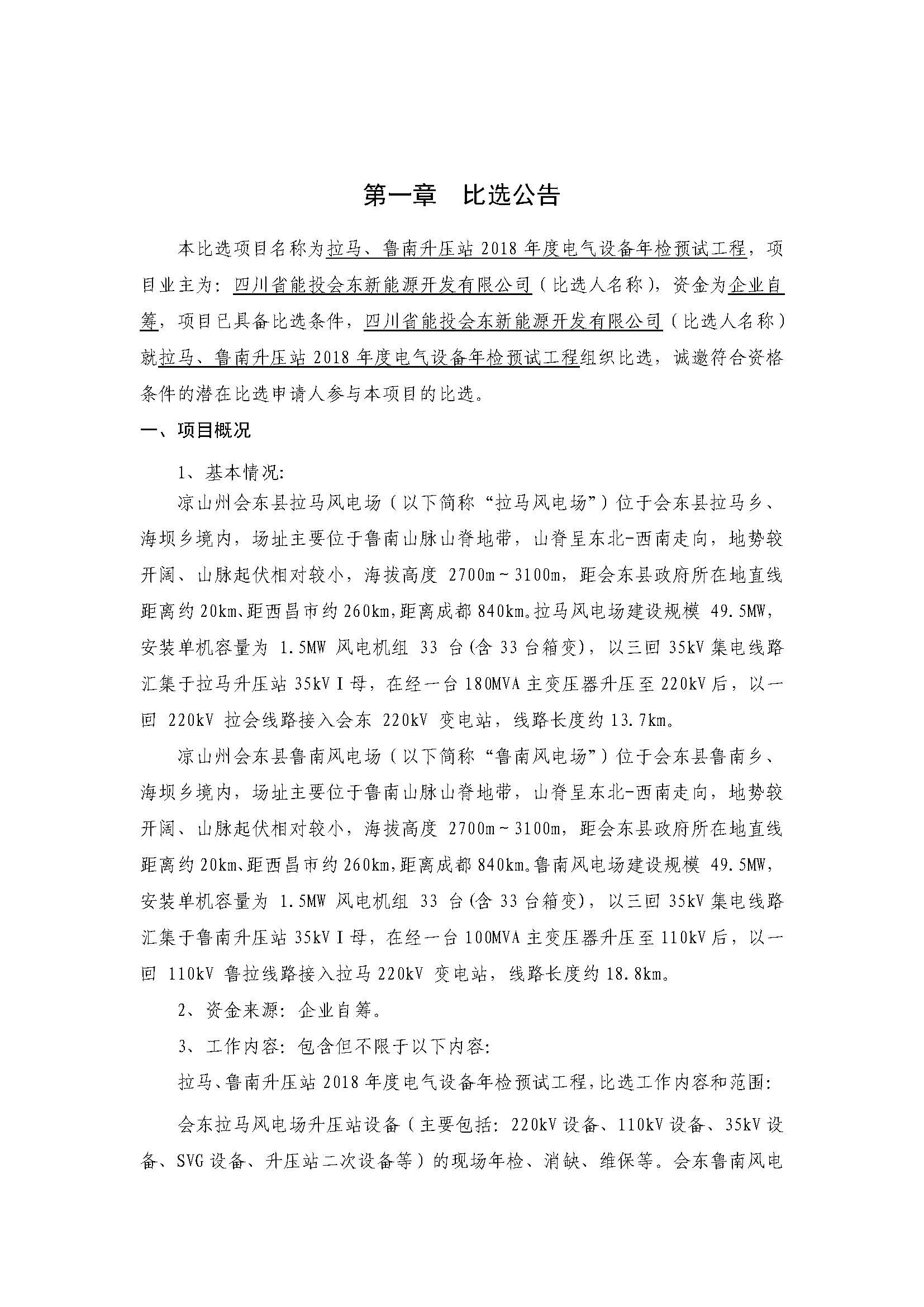 本比选项目名称为拉马、鲁南升压站2018年度电气设备年检预试工程,项目业主为:四川省能投会东新能源开发有限公司(比选人名称),资金为企业自筹,项目已具备比选条件,四川省能投会东新能源开发有限公司(比选人名称)就拉马、鲁南升压站2018年度电气设备年检预试工程组织比选,诚邀符合资格条件的潜在比选申请人参与本项目的比选。
