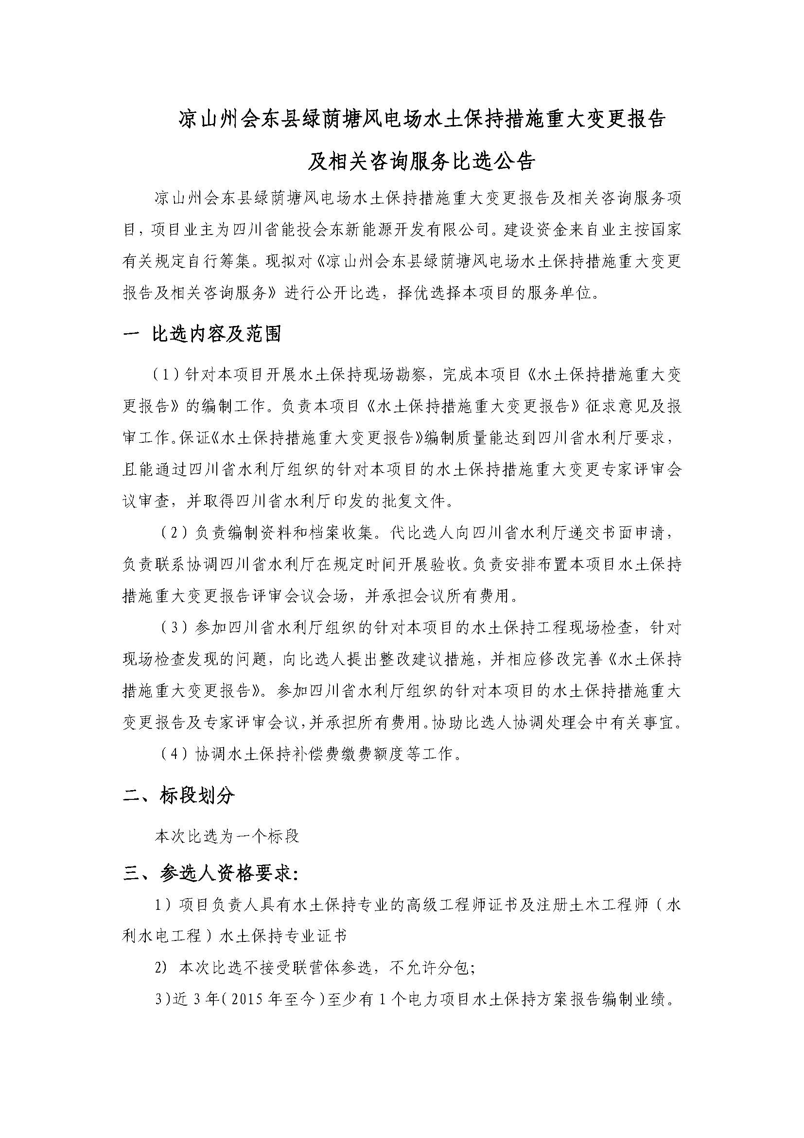 凉山州会东县绿荫塘风电场水土保持措施重大变更报告及相关咨询服务项目,项目业主为四川省能投会东新能源开发有限公司。建设资金来自业主按国家有关规定自行筹集。现拟对《凉山州会东县绿荫塘风电场水土保持措施重大变更报告及相关咨询服务》进行公开比选,择优选择本项目的服务单位。