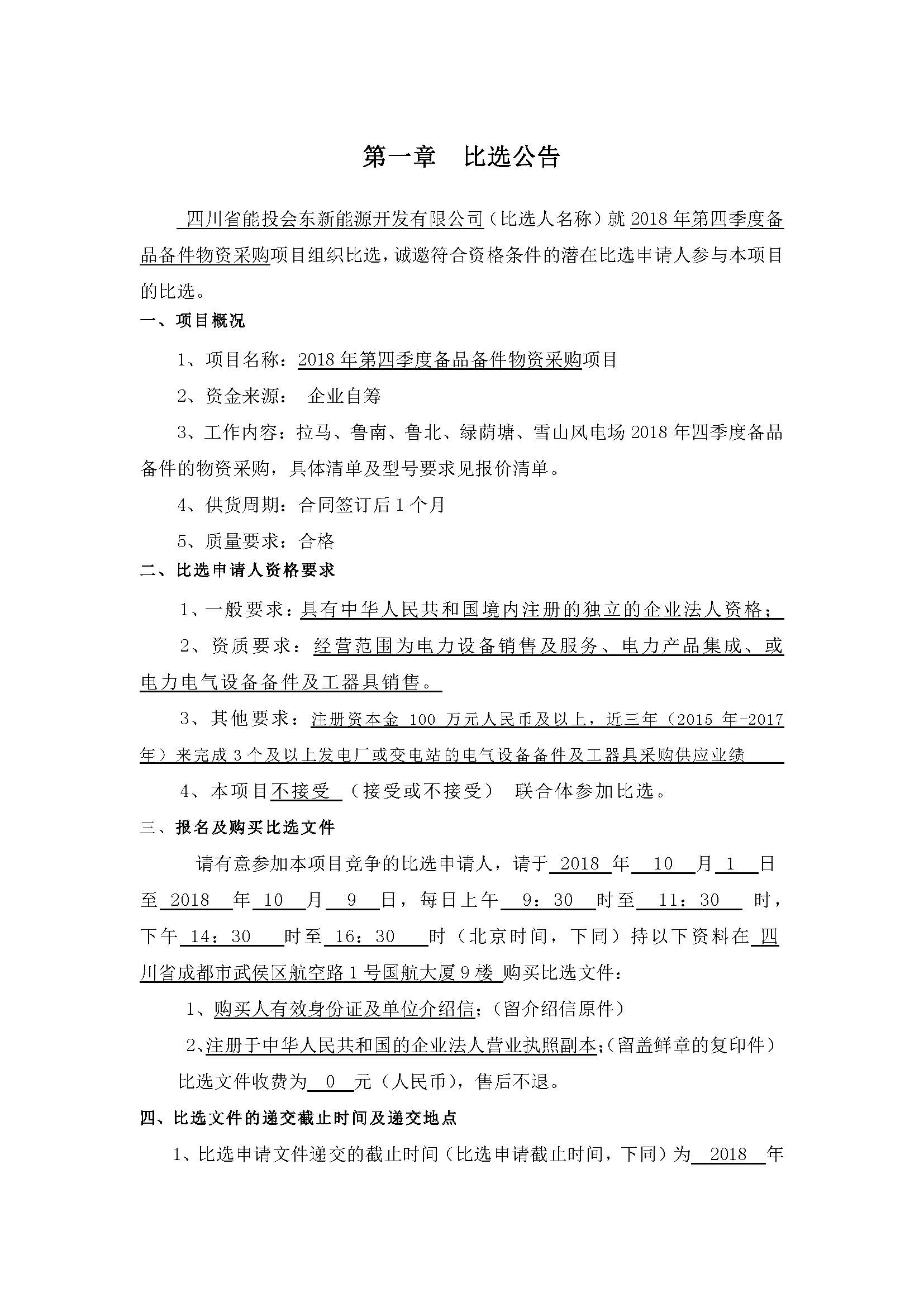 四川省能投会东新能源开发有限公司(比选人名称)就2018年第四季度备品备件物资采购项目组织比选,诚邀符合资格条件的潜在比选申请人参与本项目的比选。