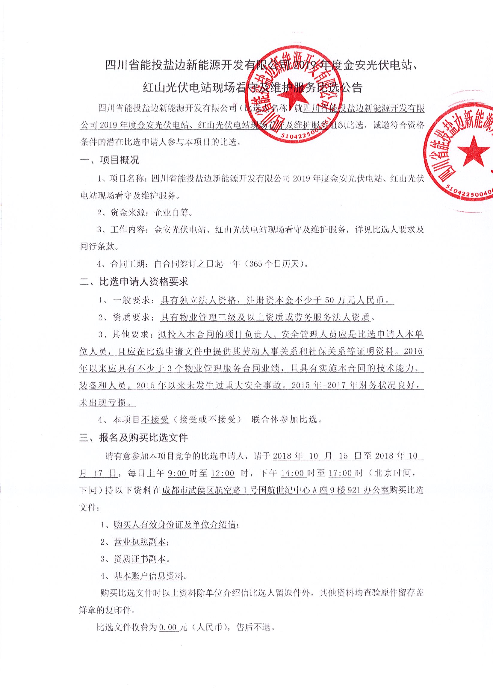 四川省能投盐边新能源开发有限公司(比选人名称)就四川省能投盐边新能源开发有限公司2019年度金安光伏电站、红山光伏电站现场看守及维护服务组织比选,诚邀符合资格条件的潜在比选申请人参与本项目的比选。