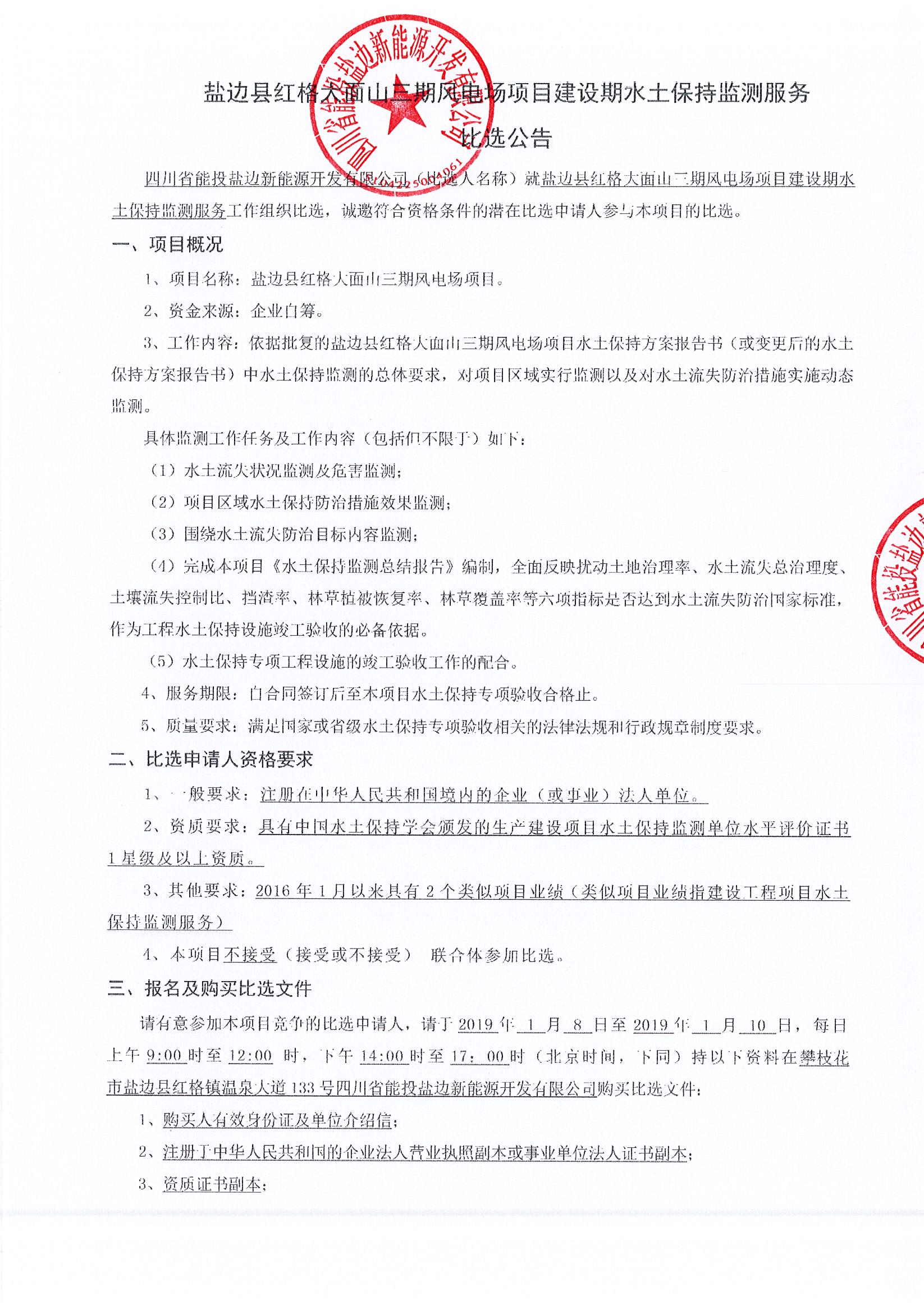 四川省能投盐边新能源开发有限公司(比选人名称)就盐边县红格大面山三期风电场项目建设期水土保持监测服务工作组织比选,诚邀符合资格条件的潜在比选申请人参与本项目的比选。