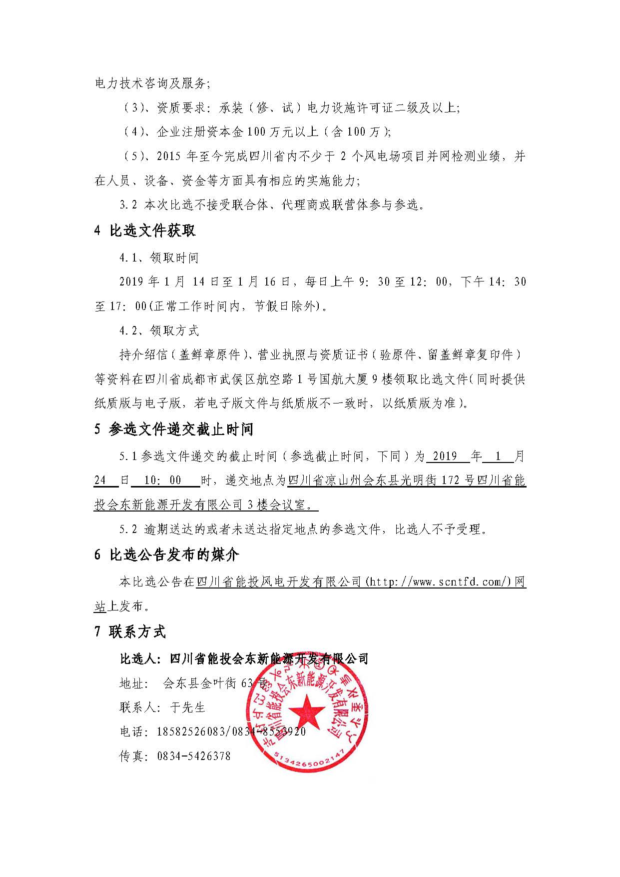 5.1参选文件递交的截止时间(参选截止时间,下同)为 2019 年 1 月 24 日 10:00 时,递交地点为四川省凉山州会东县光明街172号四川省能投会东新能源开发有限公司3楼会议室。