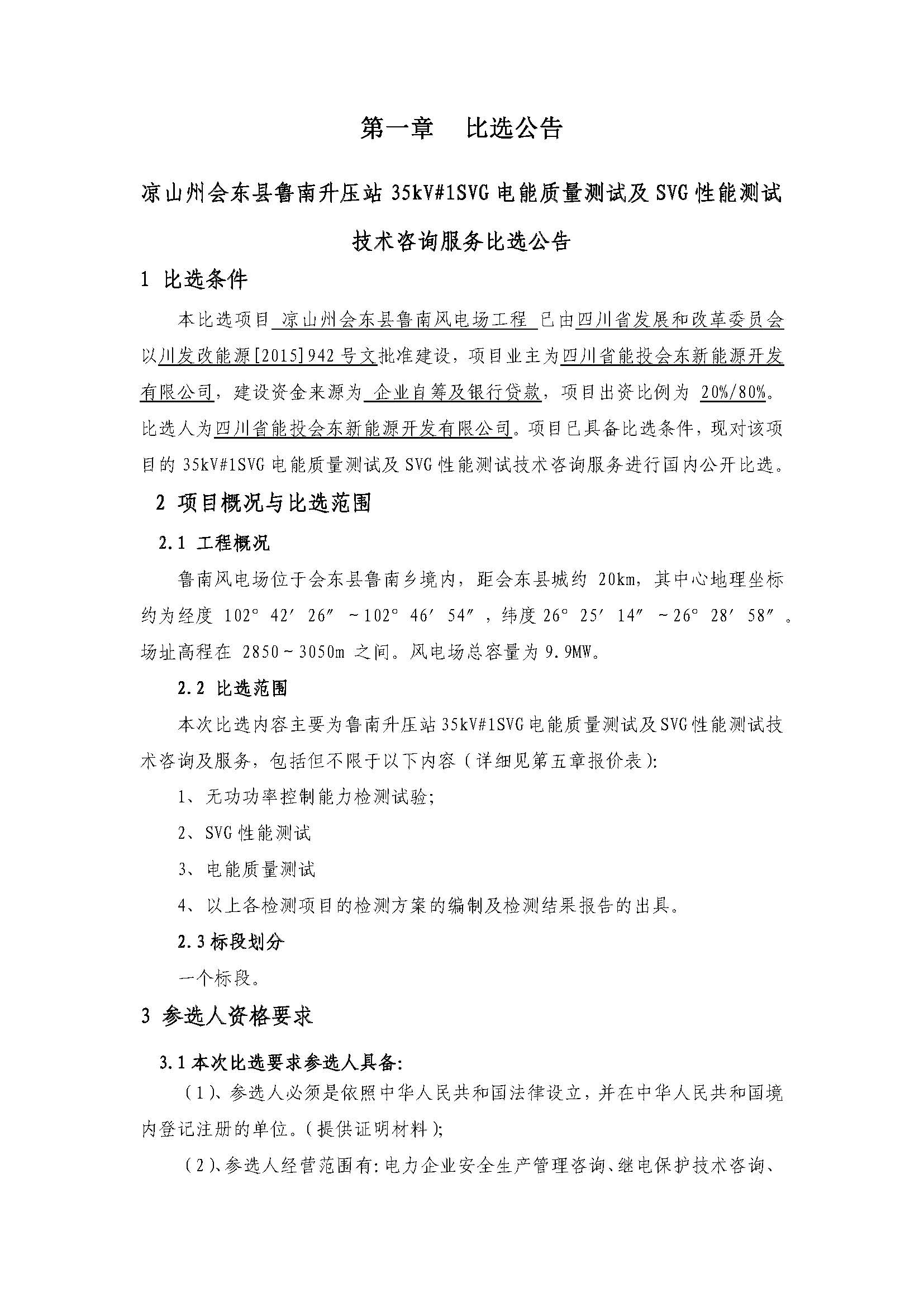 本比选项目 凉山州会东县鲁南风电场工程 已由四川省发展和改革委员会以川发改能源[2015]942号文批准建设,项目业主为四川省能投会东新能源开发有限公司,建设资金来源为 企业自筹及银行贷款,项目出资比例为20%/80%。比选人为四川省能投会东新能源开发有限公司。项目已具备比选条件,现对该项目的35kV#1SVG电能质量测试及SVG性能测试技术咨询服务进行国内公开比选。