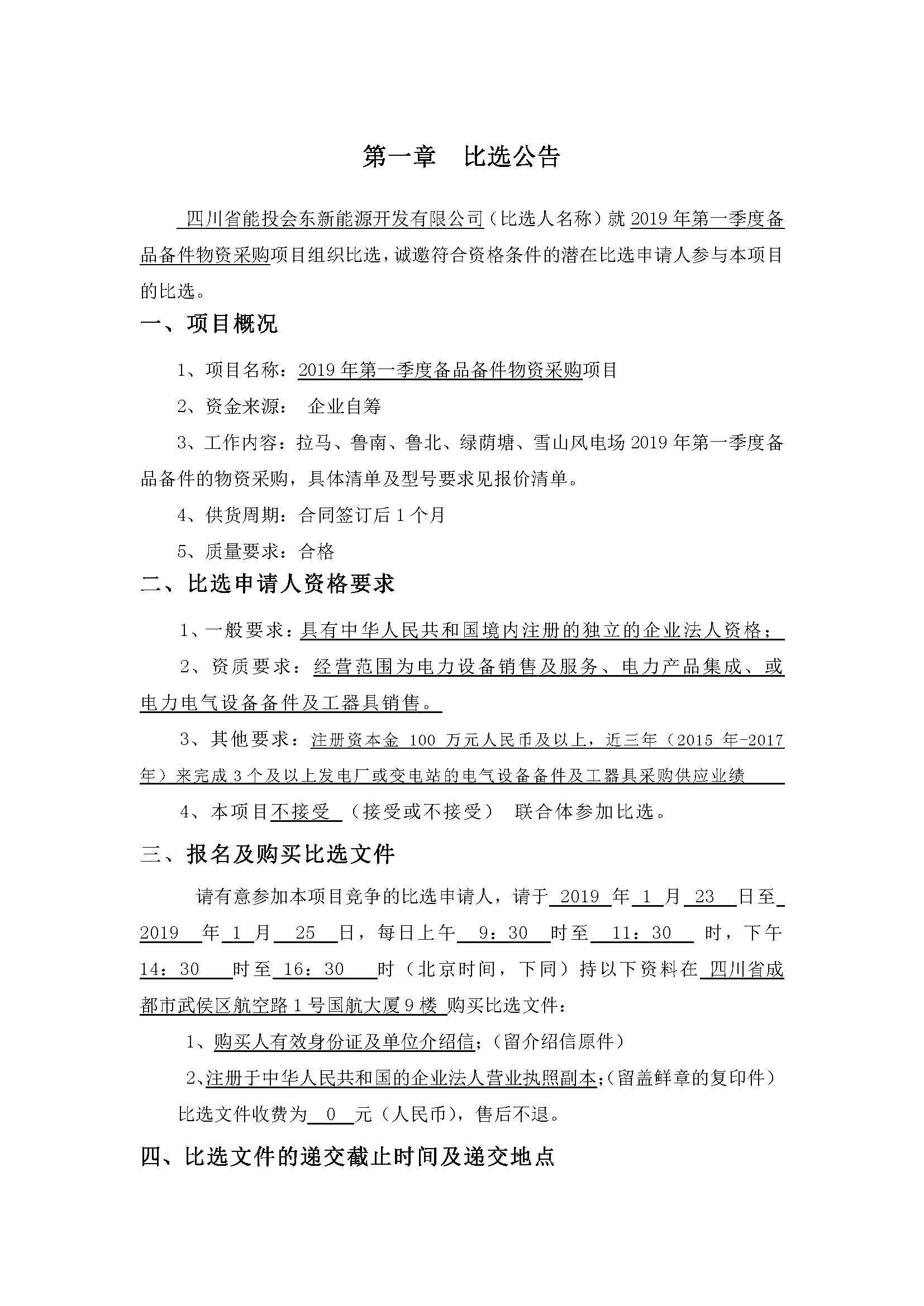 四川省能投会东新能源开发有限公司(比选人名称)就2019年第一季度备品备件物资采购项目组织比选,诚邀符合资格条件的潜在比选申请人参与本项目的比选。