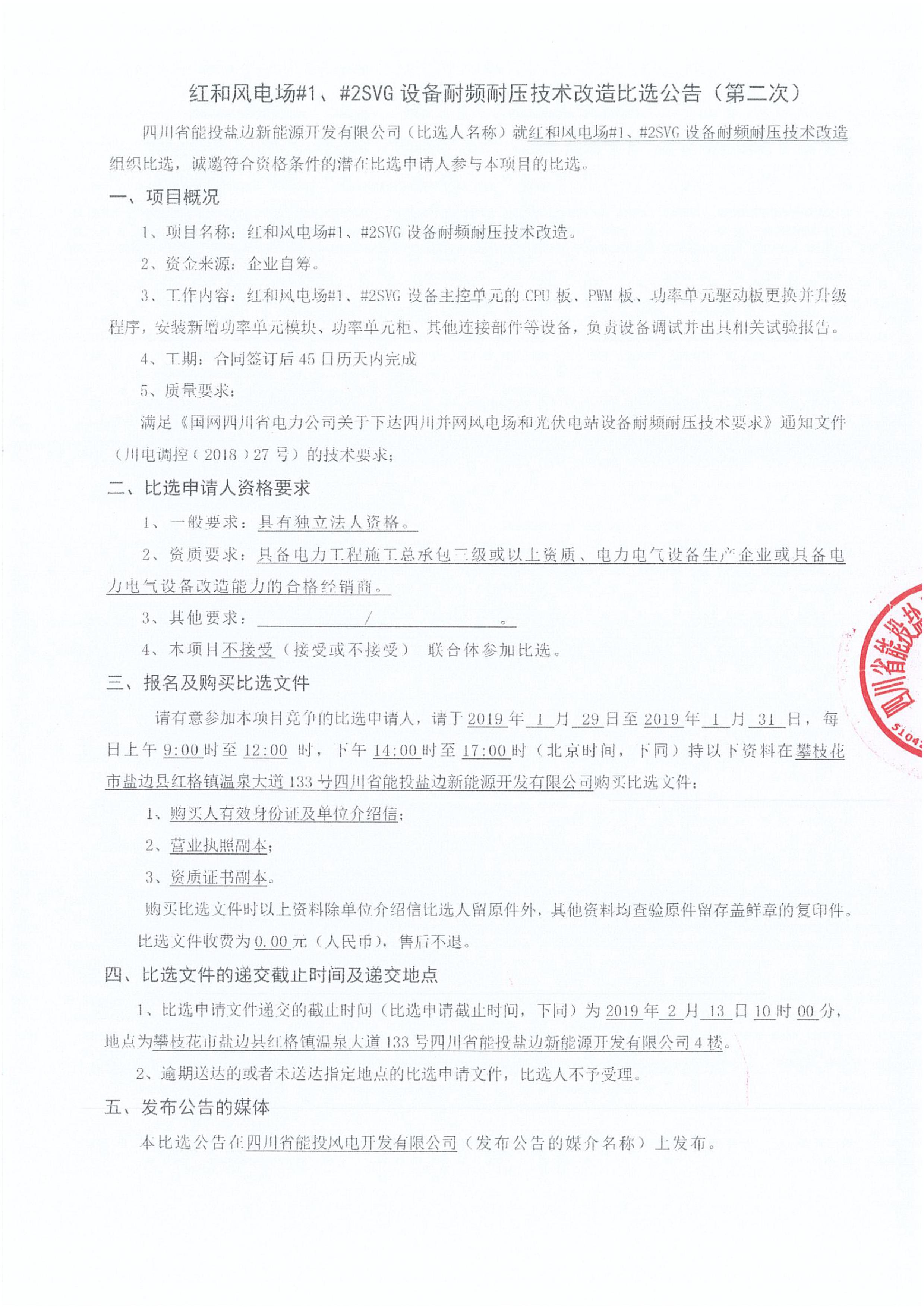四川省能投盐边新能源开发有限公司(比选人名称)就红和风电场#1、#2SVG设备耐频耐压技术改造组织比选,诚邀符合资格条件的潜在比选申请人参与本项目的比选。