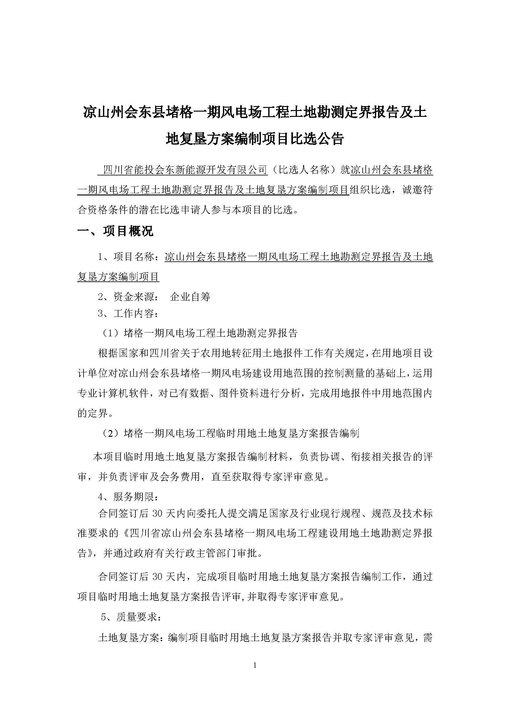 1、项目名称:凉山州会东县堵格一期风电场工程土地勘测定界报告及土地复垦方案编制项目