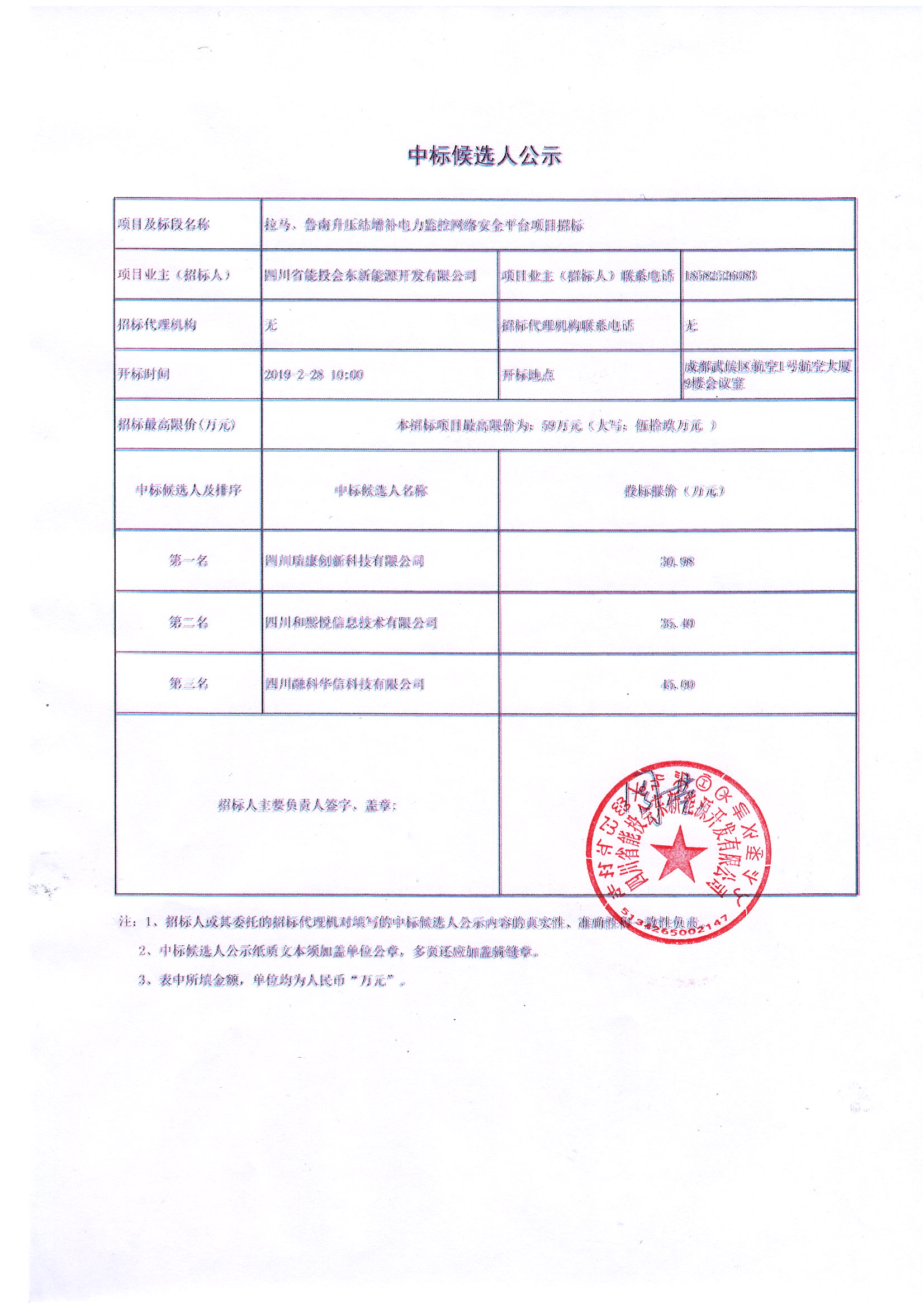 | 开标时间 | 2019/2/28 10:00 | 开标地点 | 成都武侯区航空1号航空大厦9楼会议室 | |||||