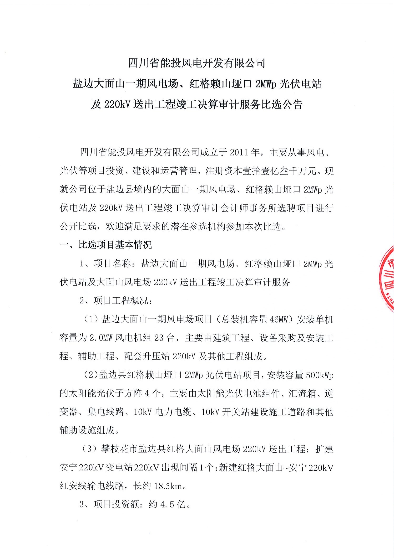 1、项目名称:盐边大面山一期风电场、红格赖山垭口2MWp光伏电站及大面山风电场220kV送出工程竣工决算审计服务