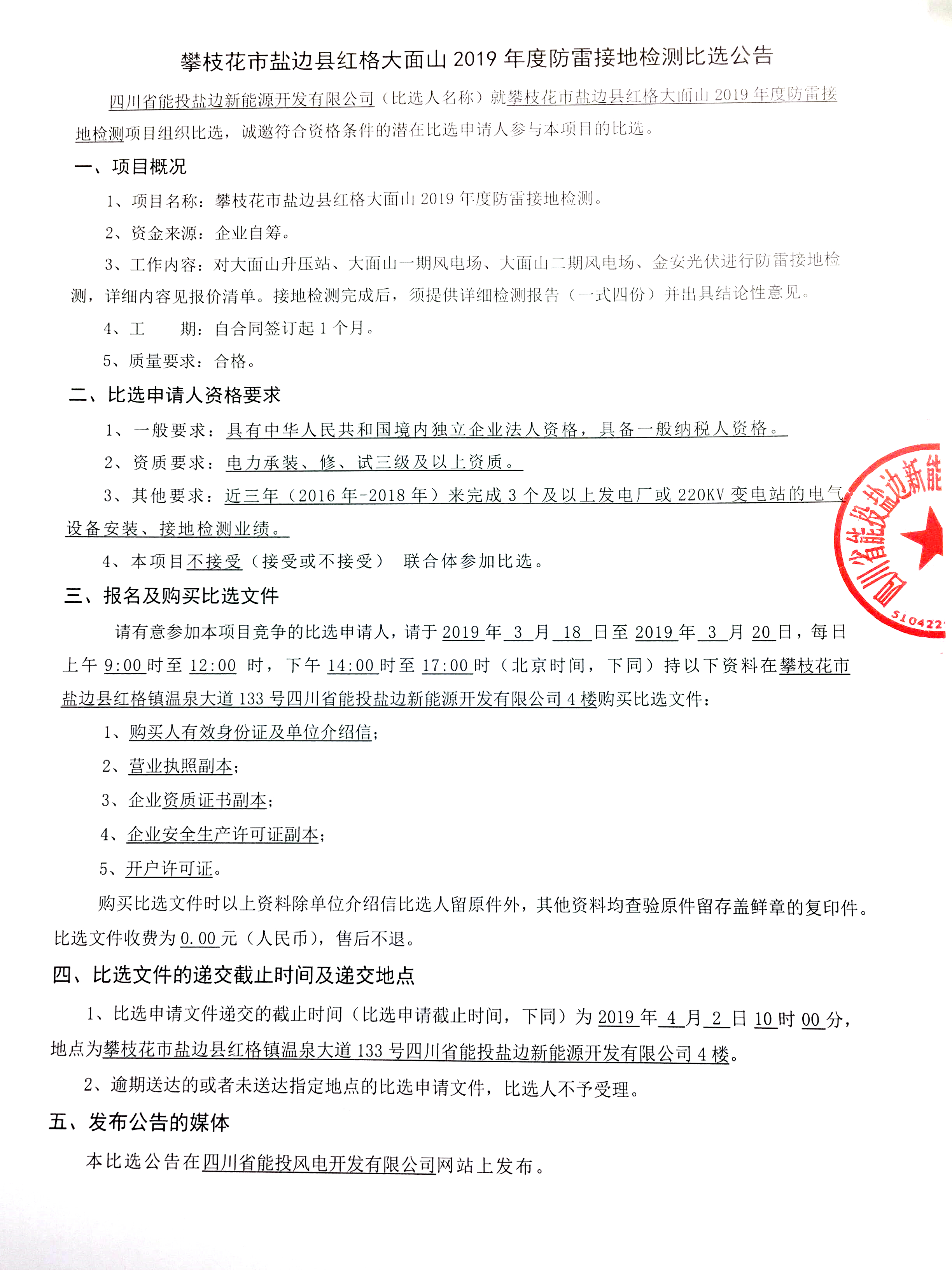 四川省能投盐边新能源开发有限公司(比选人名称)就攀枝花市盐边县红格大面山2019年度防雷接地检测项目组织比选,诚邀符合资格条件的潜在比选申请人参与本项目的比选。