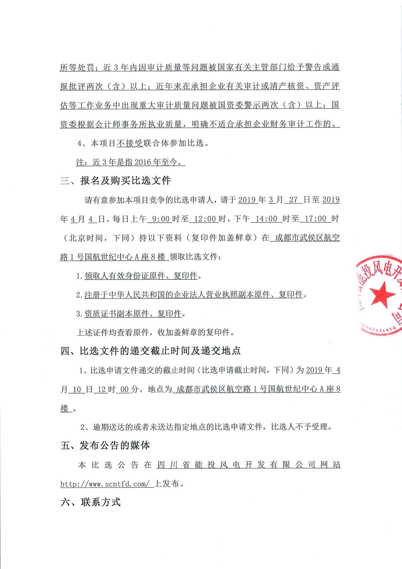 3、其他要求:存在下列情况之一的会计师事务所不得参加本次比选竞标:近3年内因违法违规行为被国家有关主管部门给予没收违法所得、罚款、暂停执行部分或全部业务、吊销有关执业许可证和撤销会计师事务所等处罚;近3年内因审计质量等问题被国家有关主管部门给予警告或通报批评两次(含)以上;近年来在承担企业有关审计或清产核资、资产评估等工作业务中出现重大审计质量问题被国资委警示两次(含)以上;国资委根据会计师事务所执业质量,明确不适合承担企业财务审计工作的。