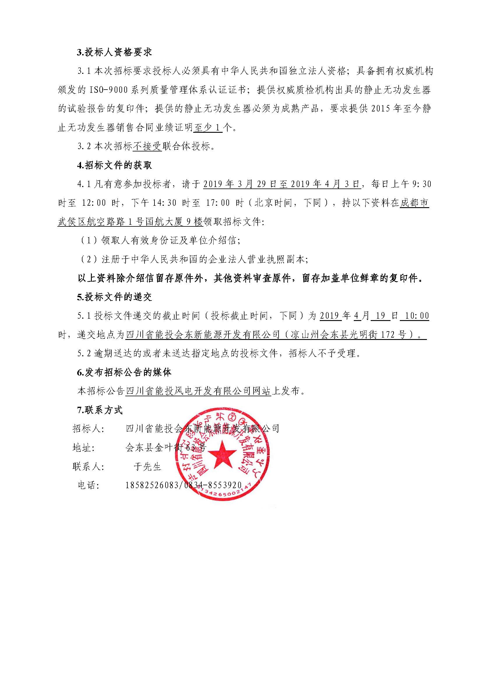 3.1本次招标要求投标人必须具有中华人民共和国独立法人资格;具备拥有权威机构颁发的ISO-9000系列质量管理体系认证证书;提供权威质检机构出具的静止无功发生器的试验报告的复印件;提供的静止无功发生器必须为成熟产品,要求提供2015年至今静止无功发生器销售合同业绩证明至少1个。