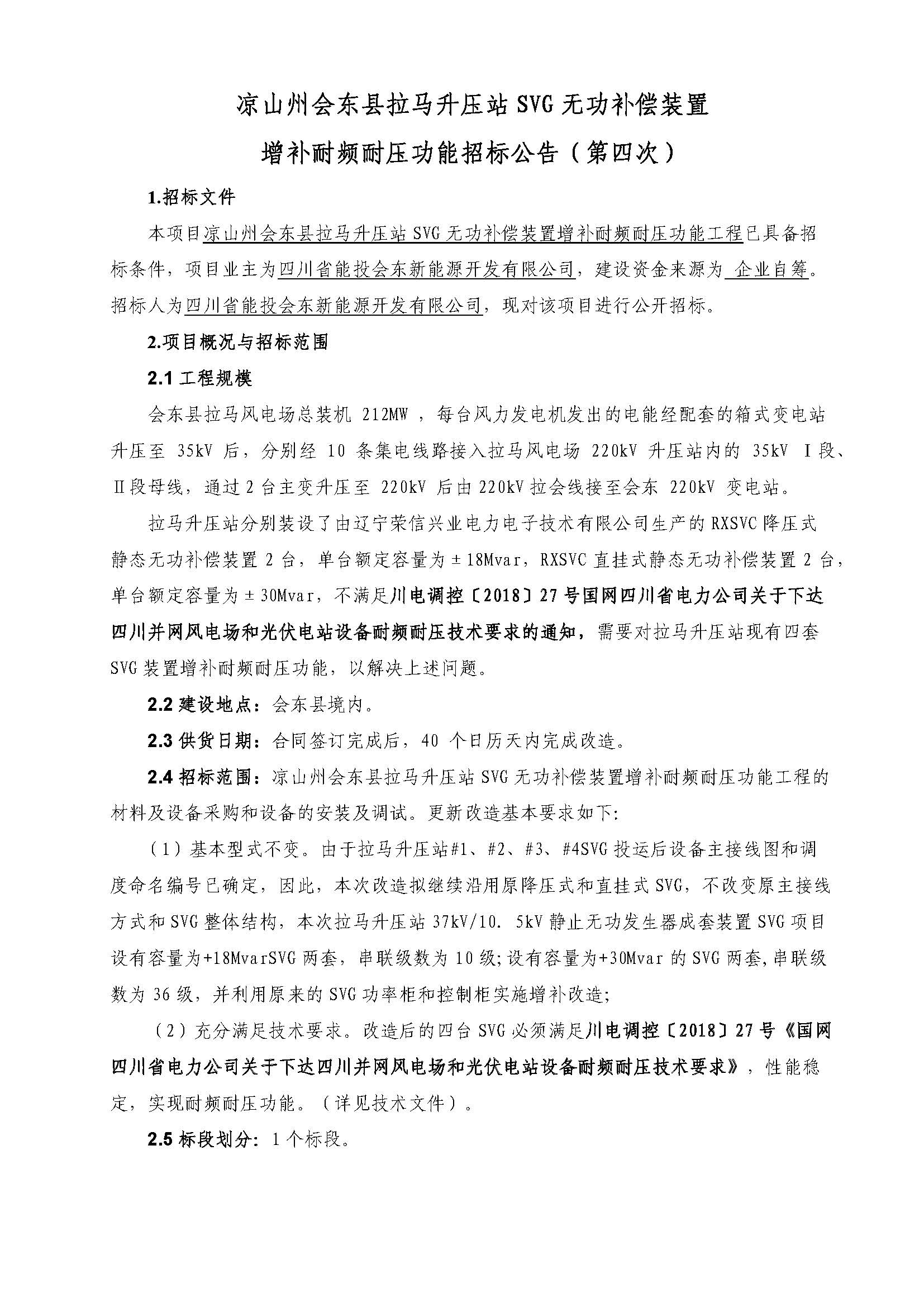 2.4招标范围:凉山州会东县拉马升压站SVG无功补偿装置增补耐频耐压功能工程的材料及设备采购和设备的安装及调试。更新改造基本要求如下: