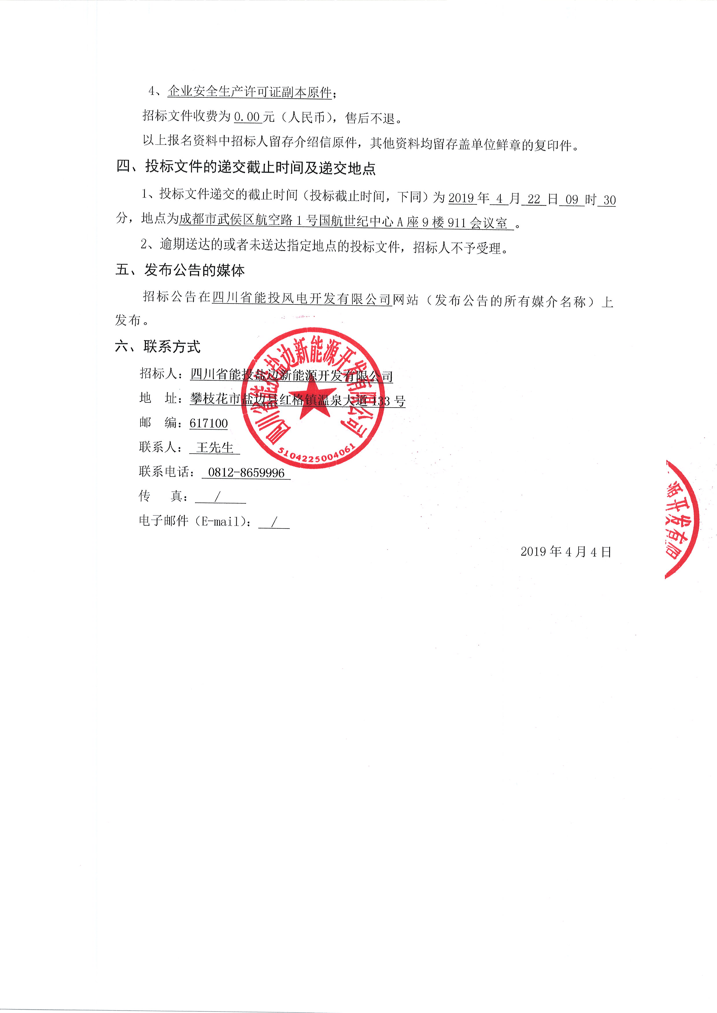 请有意参加本项目招标的投标人,请于2019年 4 月 5 日至2019年 4 月 9 日,每日上午9:00时至12:00 时,下午14:00时至17:00时(北京时间,下同)持以下资料在攀枝花市盐边县红格镇温泉大道133号四川省能投盐边新能源开发有限公司4楼购买招标文件: