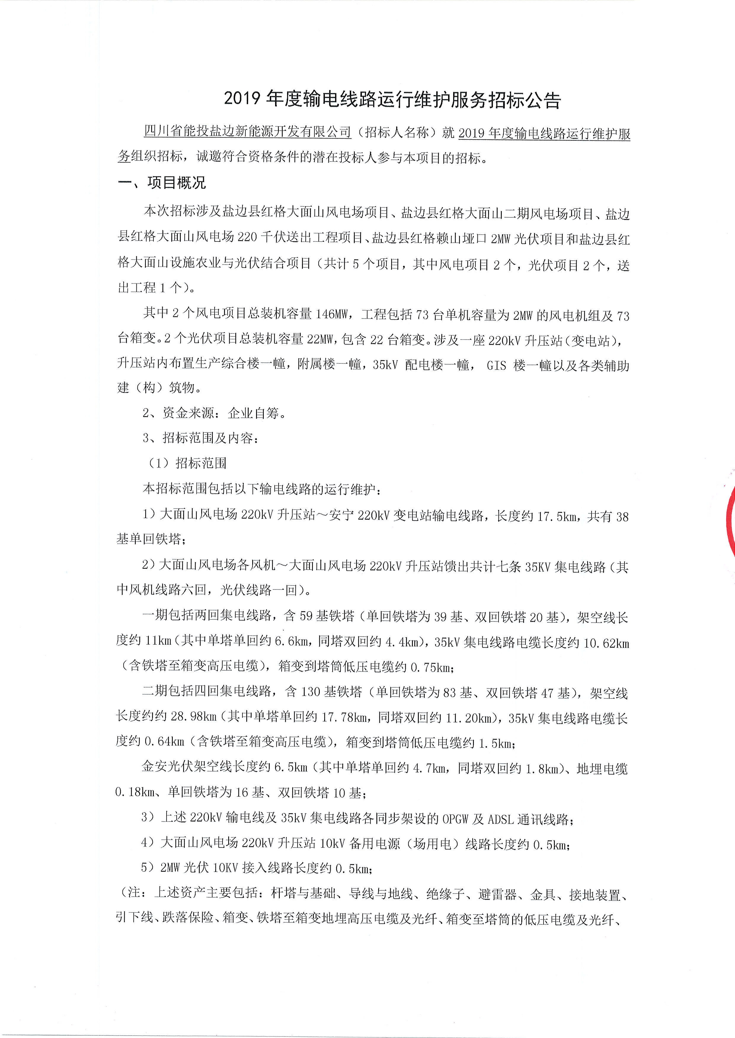 四川省能投盐边新能源开发有限公司(招标人名称)就2019年度输电线路运行维护服务组织招标,诚邀符合资格条件的潜在投标人参与本项目的招标。