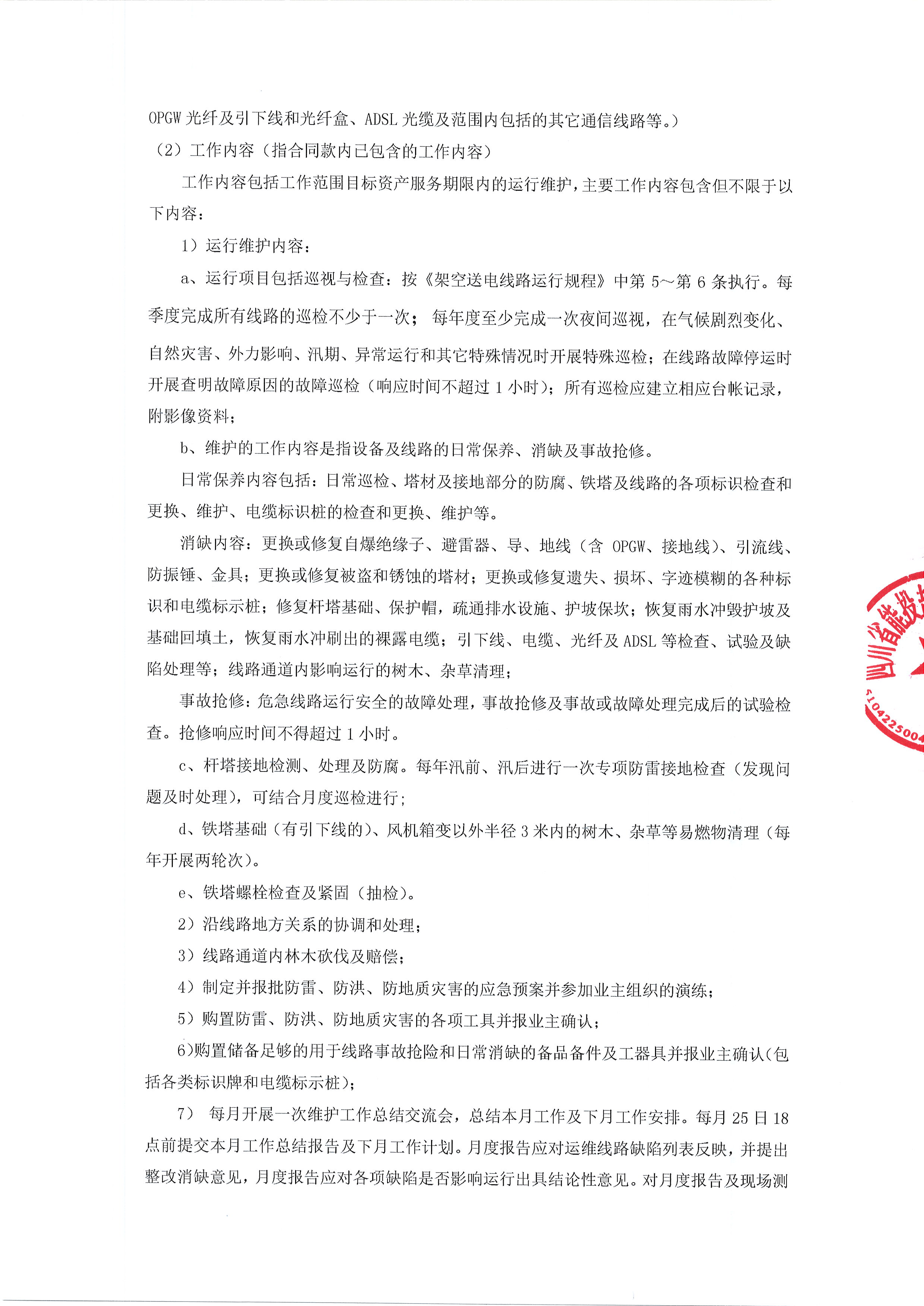 (注:上述资产主要包括:杆塔与基础、导线与地线、绝缘子、避雷器、金具、接地装置、引下线、跌落保险、箱变、铁塔至箱变地埋高压电缆及光纤、箱变至塔筒的低压电缆及光纤、OPGW光纤及引下线和光纤盒、ADSL光缆及范围内包括的其它通信线路等。)