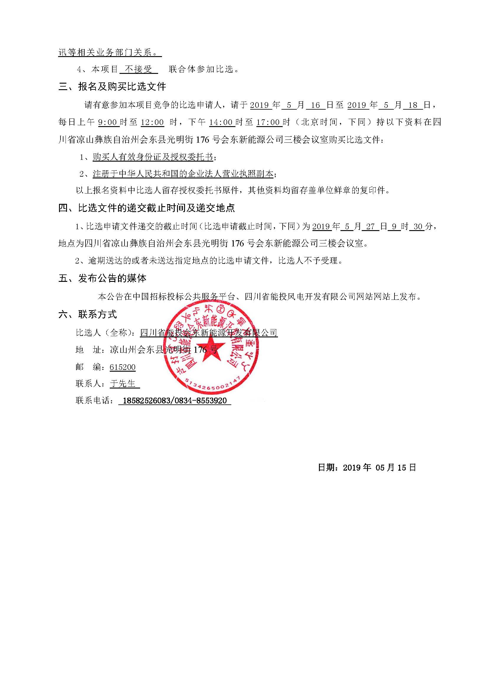 请有意参加本项目竞争的比选申请人,请于2019年 5 月 16 日至2019年 5 月 18 日,每日上午9:00时至12:00 时,下午14:00时至17:00时(北京时间,下同)持以下资料在四川省凉山彝族自治州会东县光明街176号会东新能源公司三楼会议室购买比选文件: