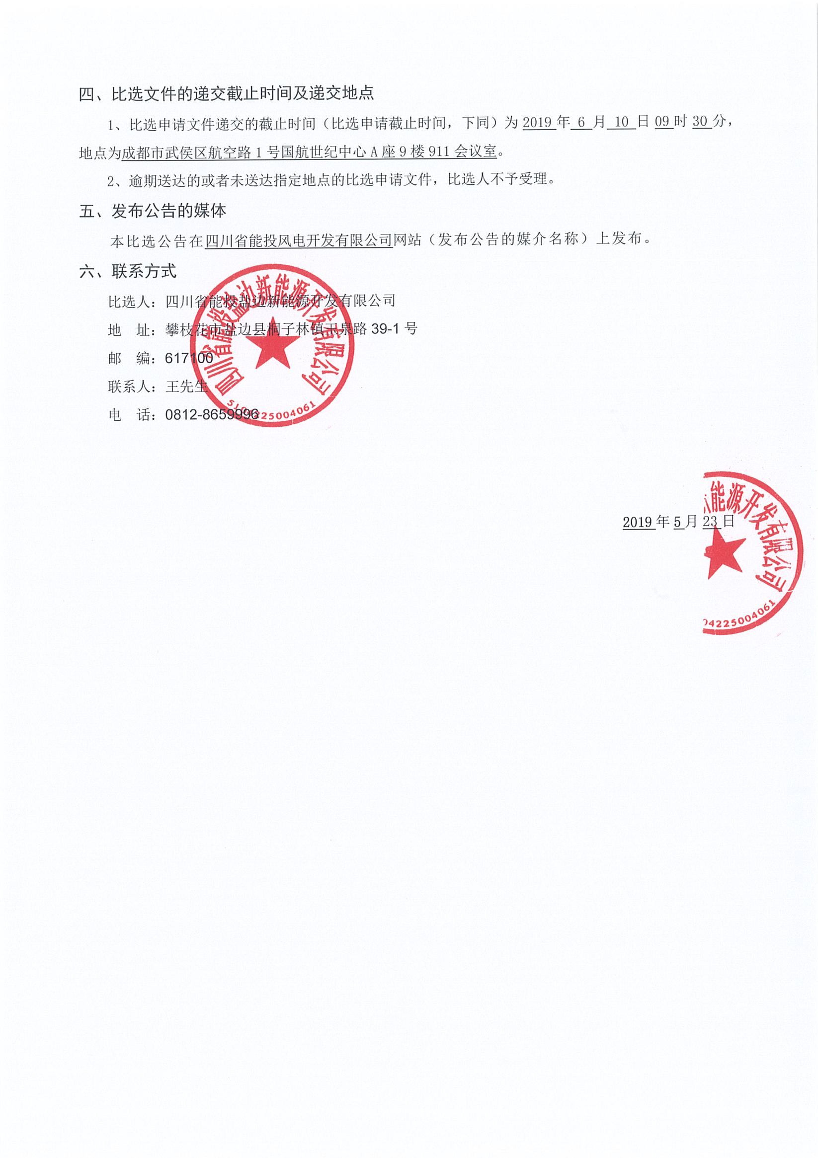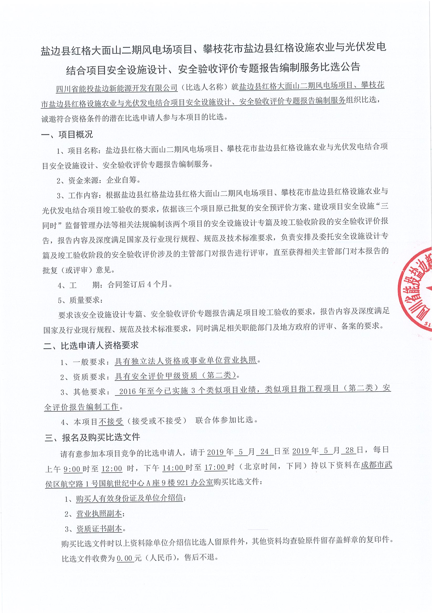 四川省能投盐边新能源开发有限公司(比选人名称)就盐边县红格大面山二期风电场项目、攀枝花市盐边县红格设施农业与光伏发电结合项目安全设施设计、安全验收评价专题报告编制服务组织比选,诚邀符合资格条件的潜在比选申请人参与本项目的比选。
