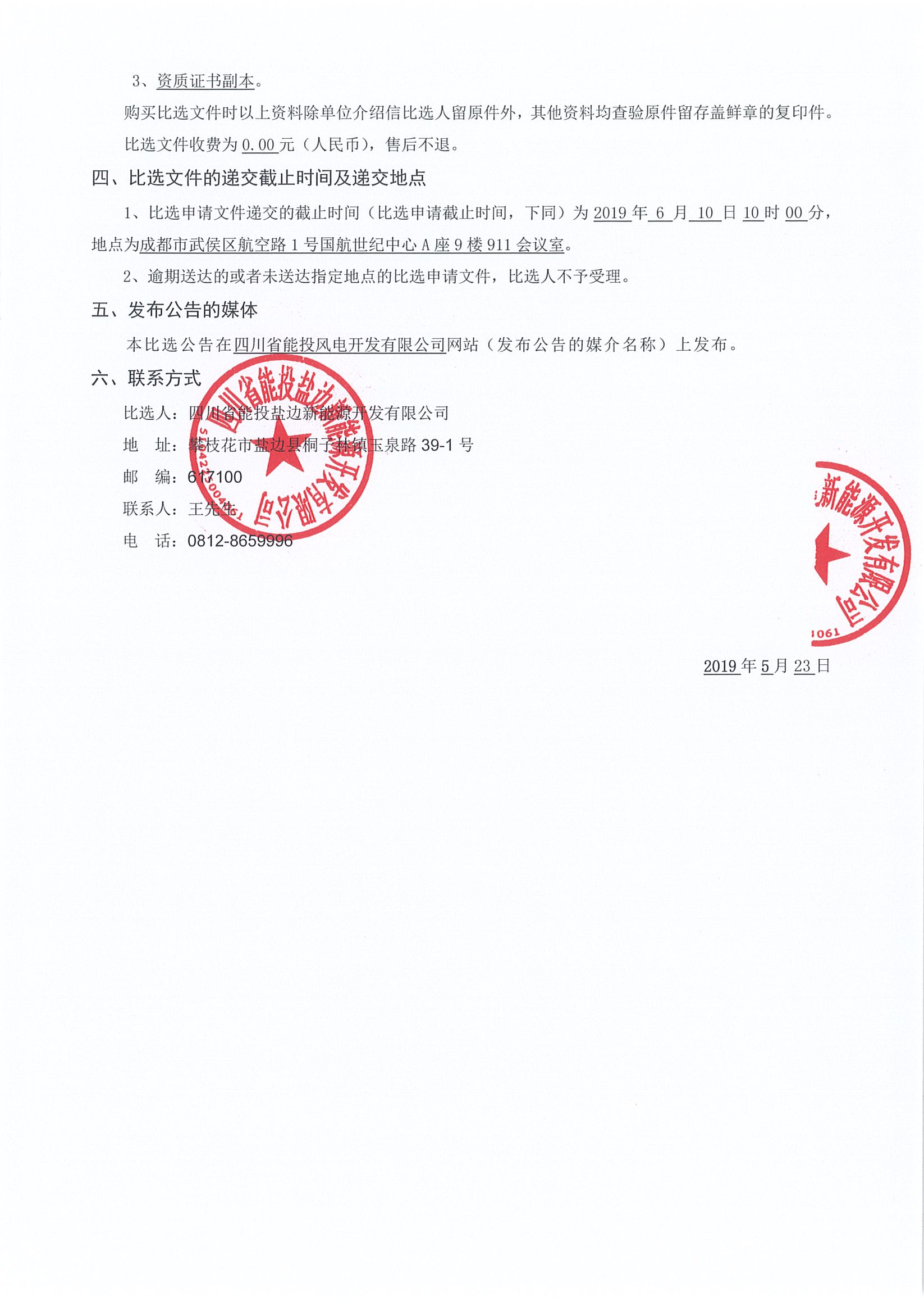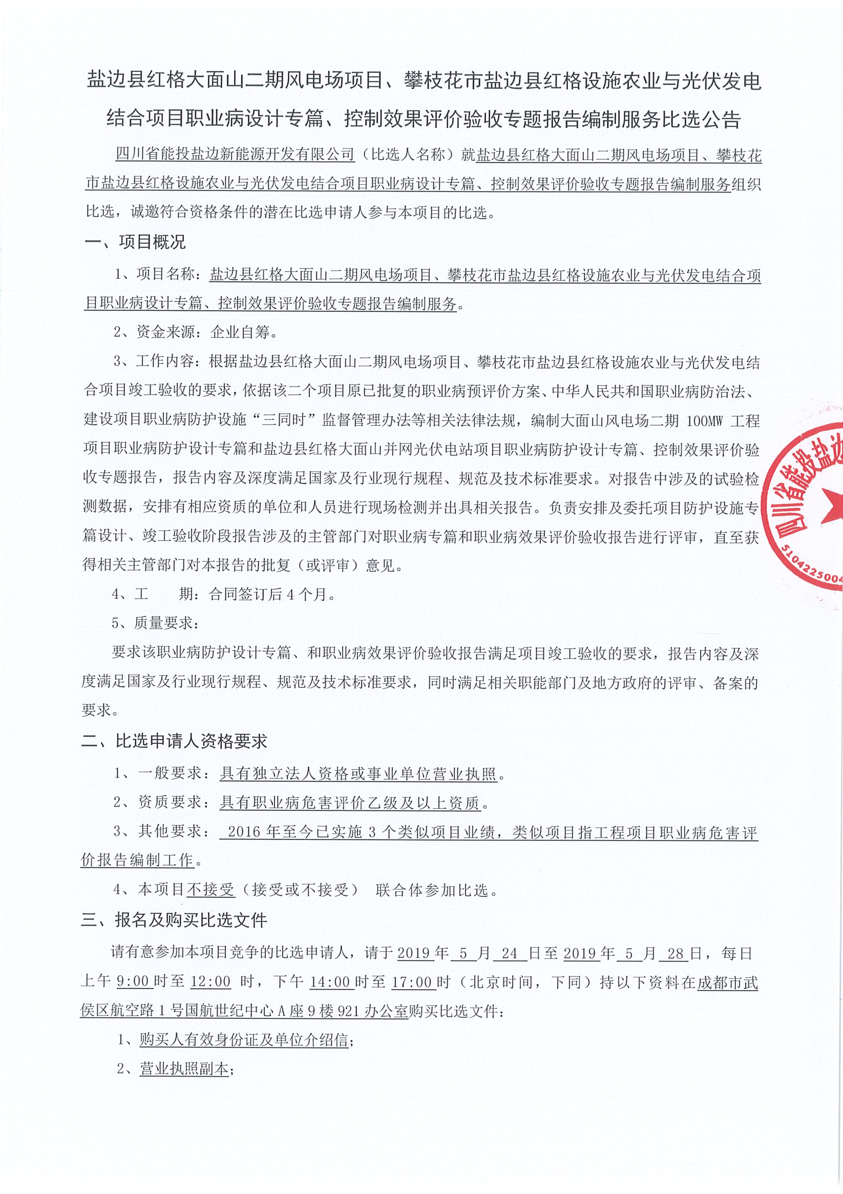 四川省能投盐边新能源开发有限公司(比选人名称)就盐边县红格大面山二期风电场项目、攀枝花市盐边县红格设施农业与光伏发电结合项目职业病设计专篇、控制效果评价验收专题报告编制服务组织比选,诚邀符合资格条件的潜在比选申请人参与本项目的比选。