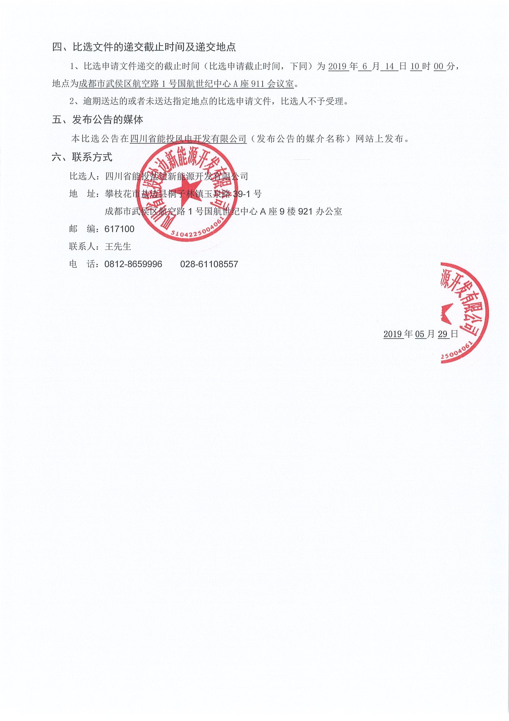 请有意参加本项目竞争的比选申请人,请于2019年 5 月 30 日至2019年 6 月 3日,每日上午9:00时至12:00 时,下午14:00时至17:00时(北京时间,下同)持以下资料在成都市武侯区航空路1号国航世纪中心A座9楼921办公室四川省能投盐边新能源开发有限公司购买比选文件: