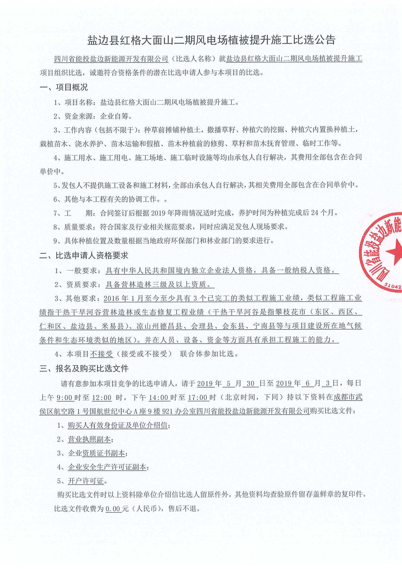 四川省能投盐边新能源开发有限公司(比选人名称)就盐边县红格大面山二期风电场植被提升施工项目组织比选,诚邀符合资格条件的潜在比选申请人参与本项目的比选。