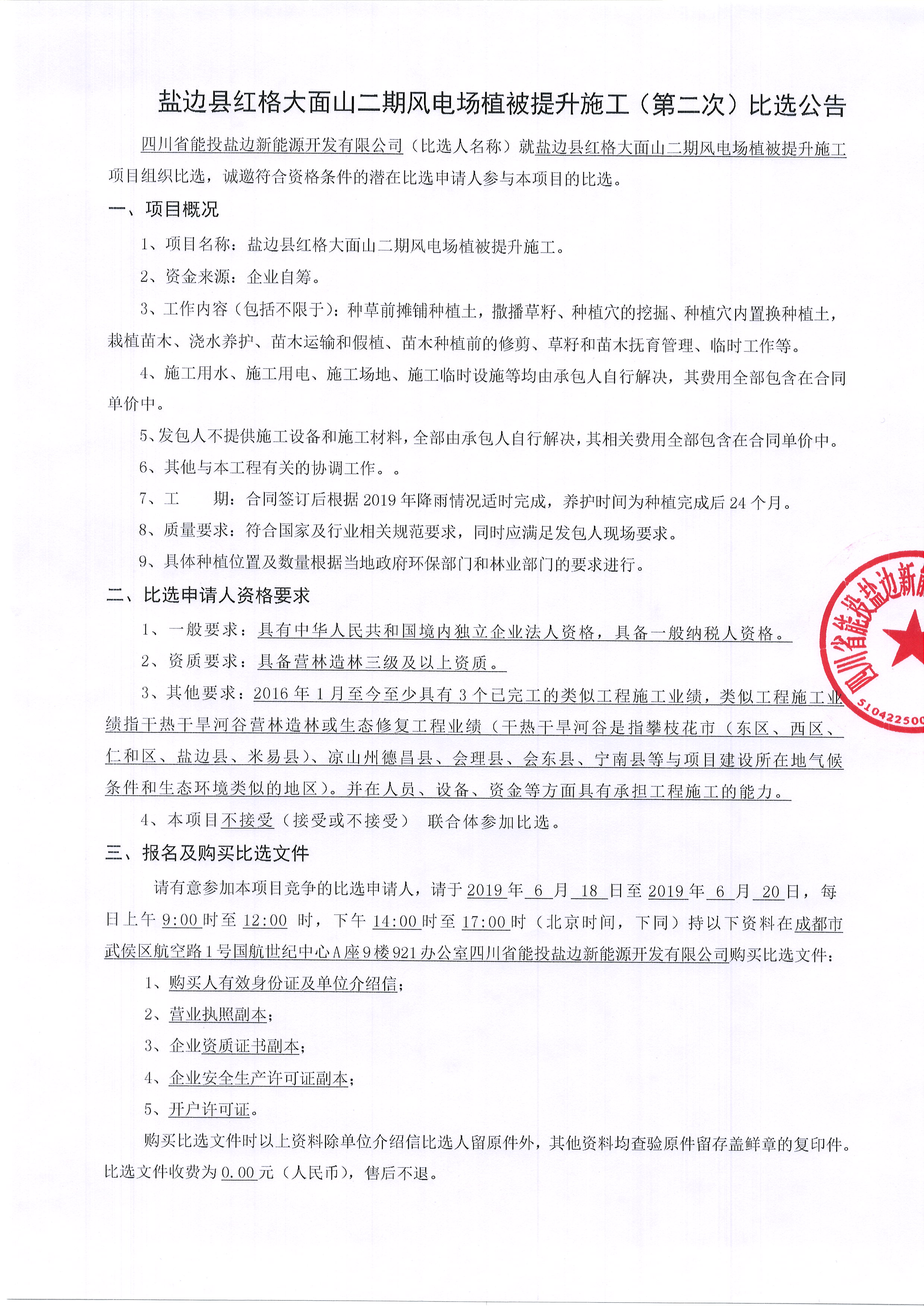 四川省能投盐边新能源开发有限公司(比选人名称)就盐边县红格大面山二期风电场植被提升施工项目组织比选,诚邀符合资格条件的潜在比选申请人参与本项目的比选。
