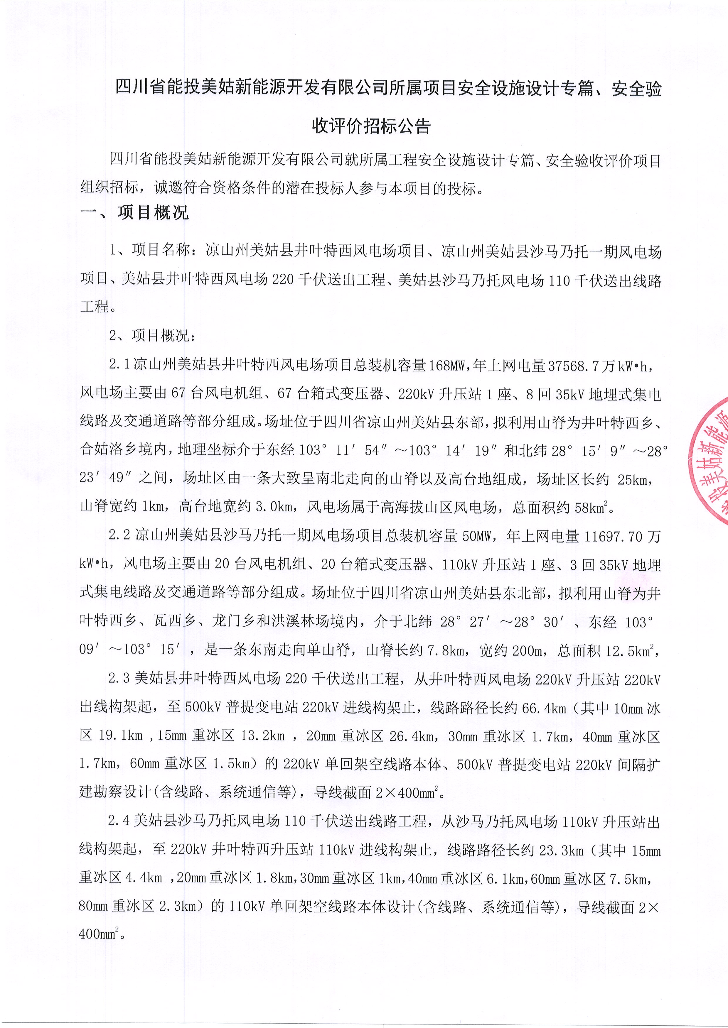 1、项目名称:凉山州美姑县井叶特西风电场项目、凉山州美姑县沙马乃托一期风电场项目、美姑县井叶特西风电场220千伏送出工程、美姑县沙马乃托风电场110千伏送出线路工程。