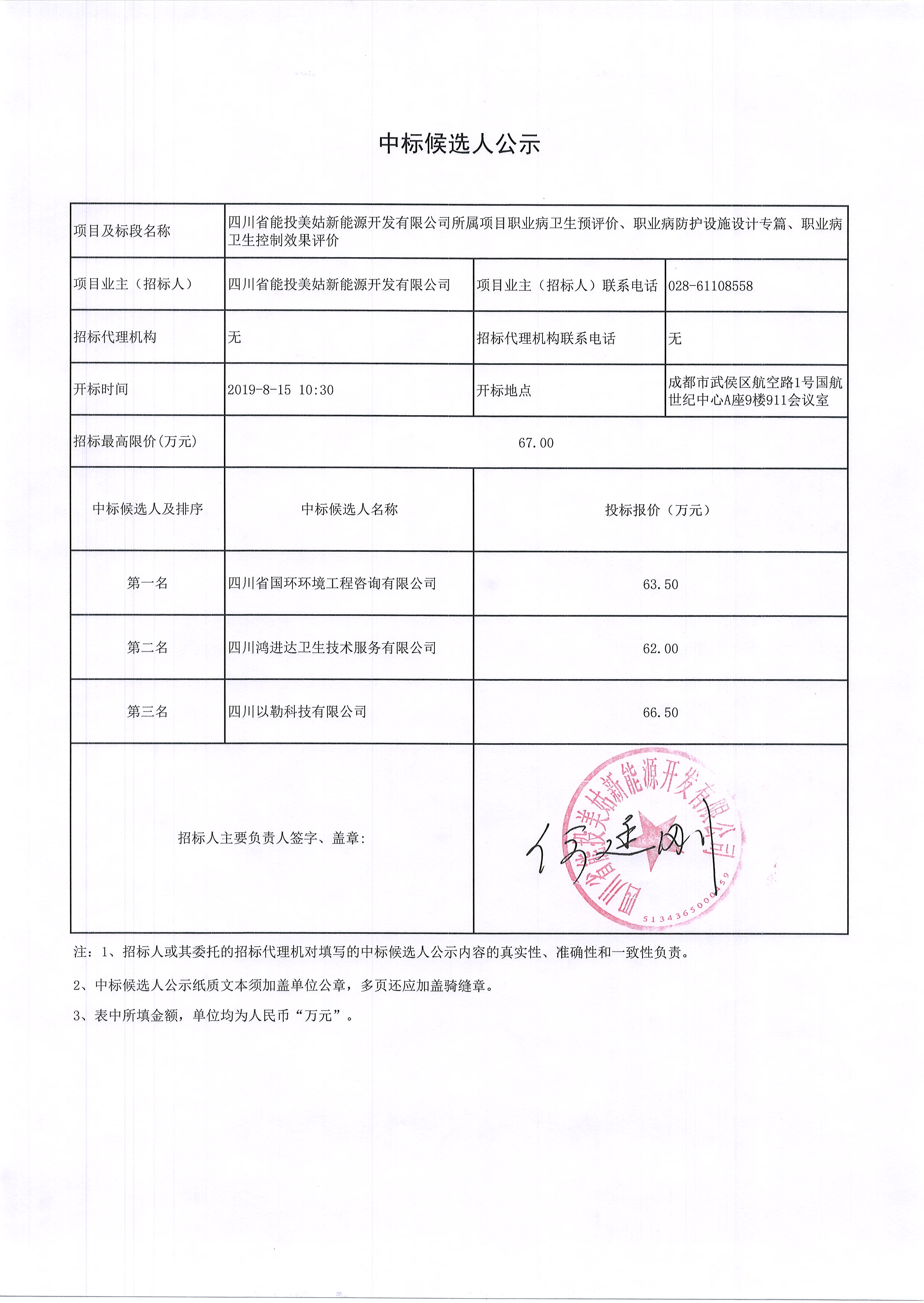 四川省能投美姑新能源开发有限公司所属项目职业病卫生预评价、职业病防护设施设计专篇、职业病卫生控制效果评价中标候选人公示