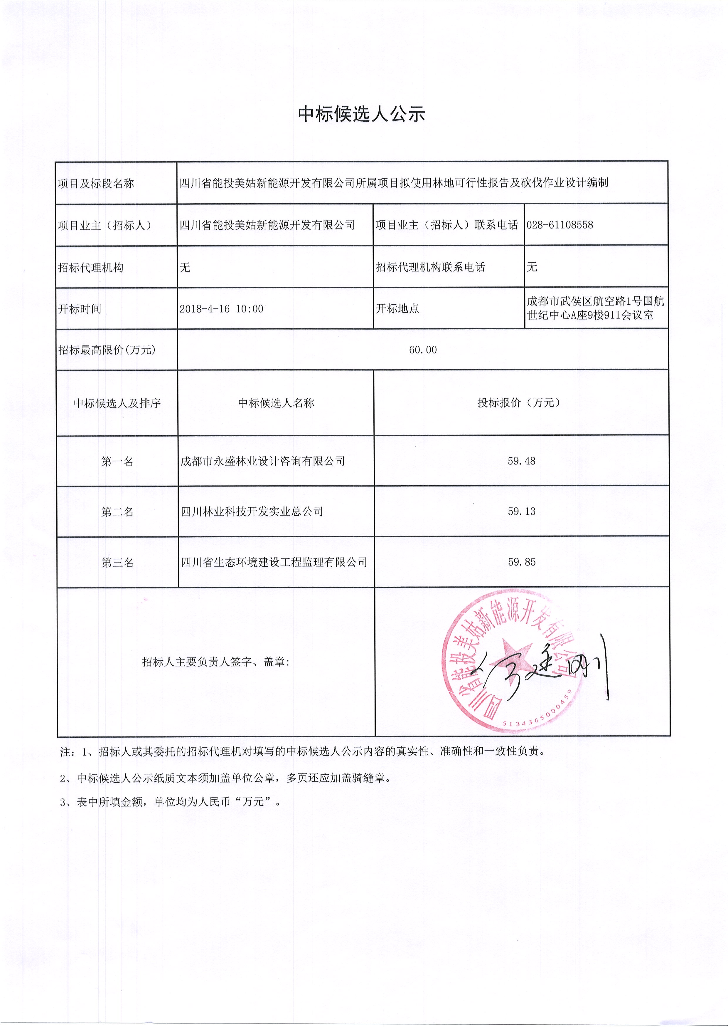 四川省能投美姑新能源开发有限公司所属项目拟使用林地可行性报告及砍伐作业设计编制中标候选人公示