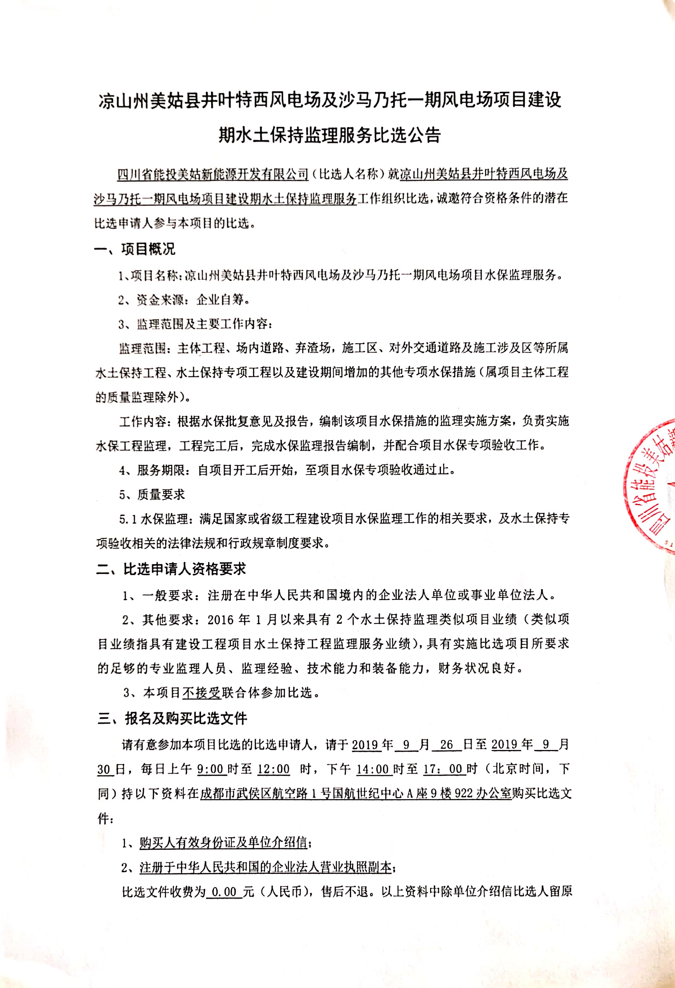 四川省能投美姑新能源开发有限公司(比选人名称)就凉山州美姑县井叶特西风电场及沙马乃托一期风电场项目建设期水土保持监理服务工作组织比选,诚邀符合资格条件的潜在比选申请人参与本项目的比选。