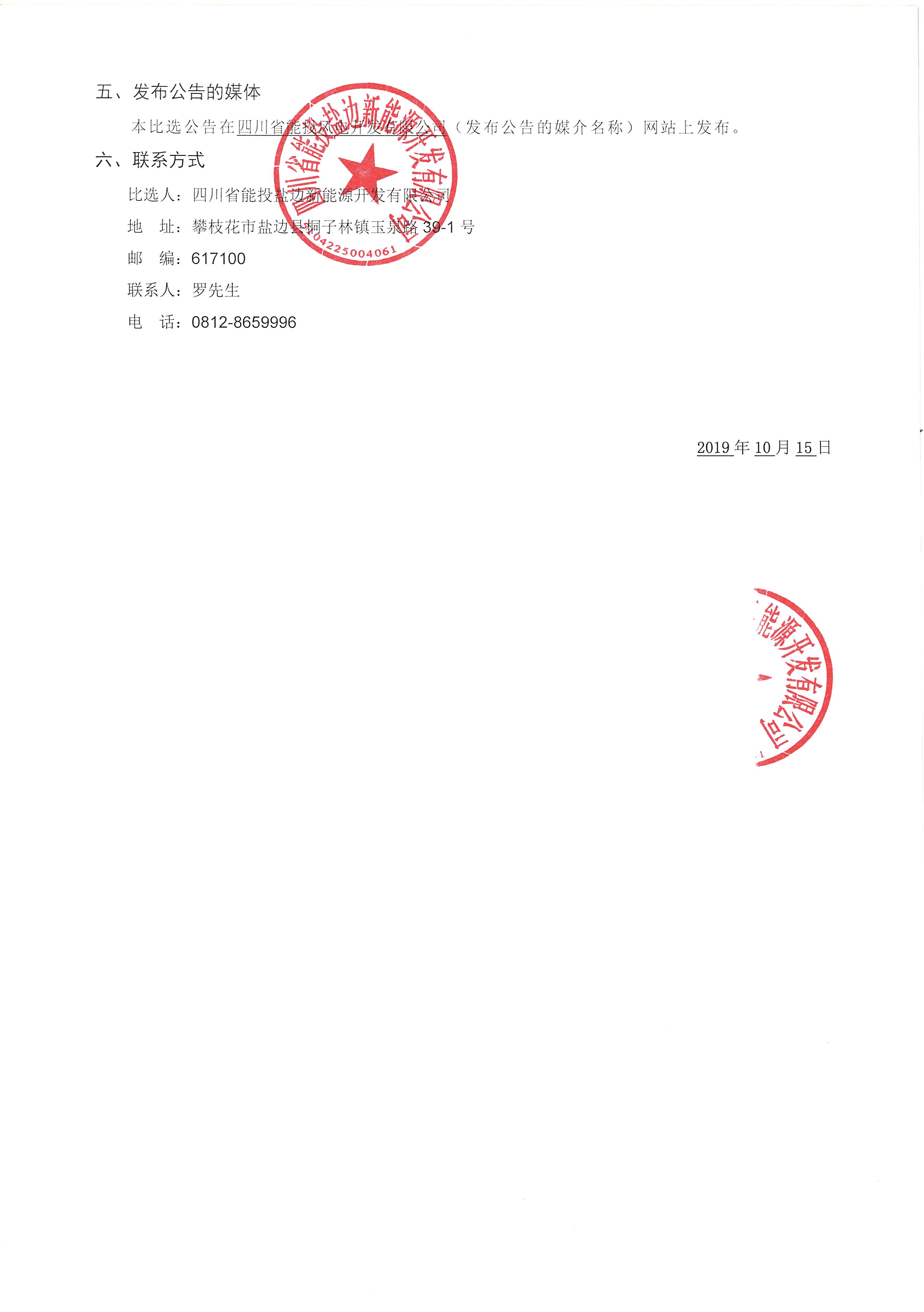请有意参加本项目竞争的比选申请人,请于2019年10月16日至2019年10月21日,每日上午9:00时至12:00 时,下午14:00时至17:00时(北京时间,下同)持以下资料在攀枝花市盐边县红格镇温泉大道133号四川省能投盐边新能源开发有限公司4楼购买比选文件: