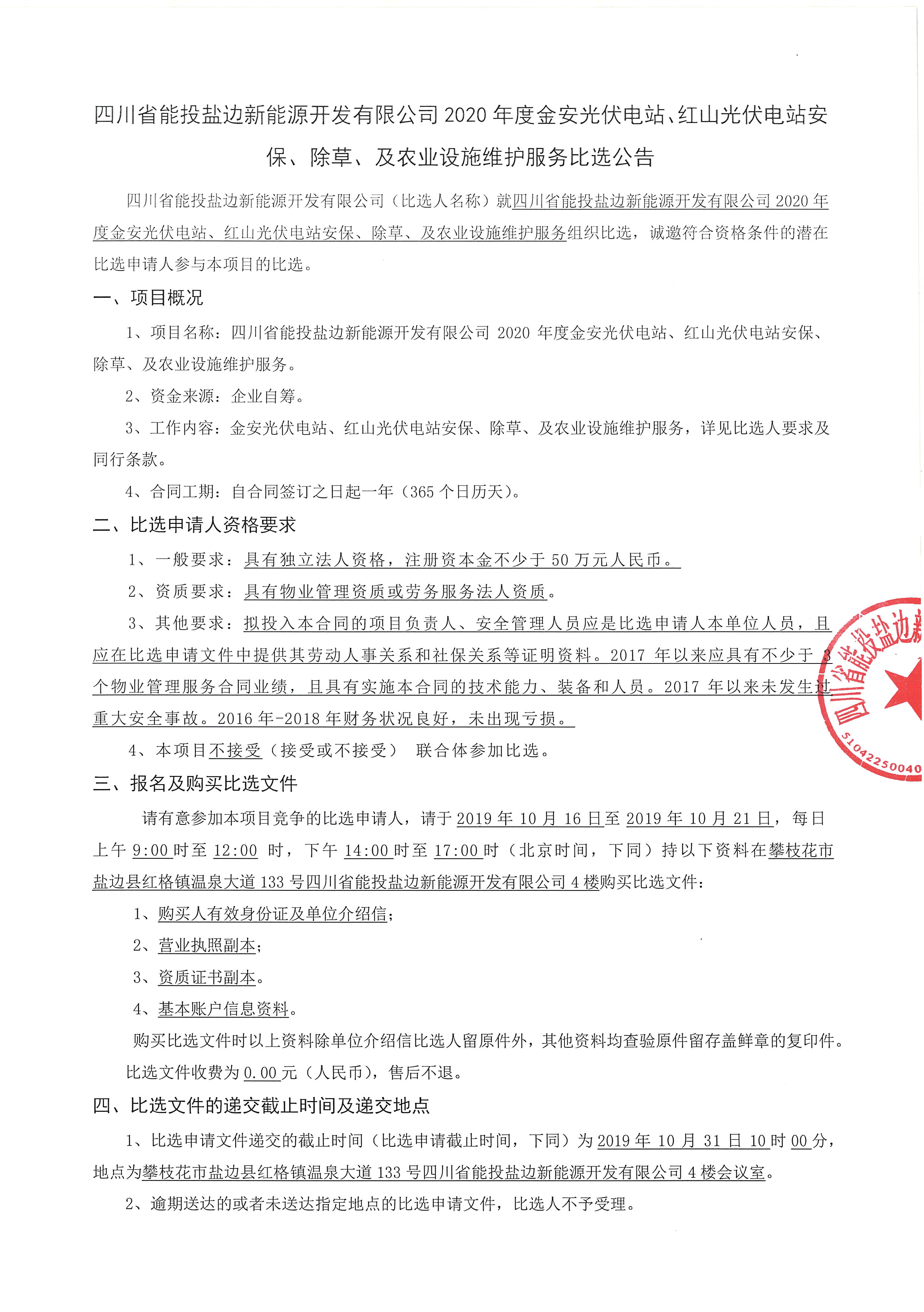 四川省能投盐边新能源开发有限公司(比选人名称)就四川省能投盐边新能源开发有限公司2020年度金安光伏电站、红山光伏电站安保、除草、及农业设施维护服务组织比选,诚邀符合资格条件的潜在比选申请人参与本项目的比选。