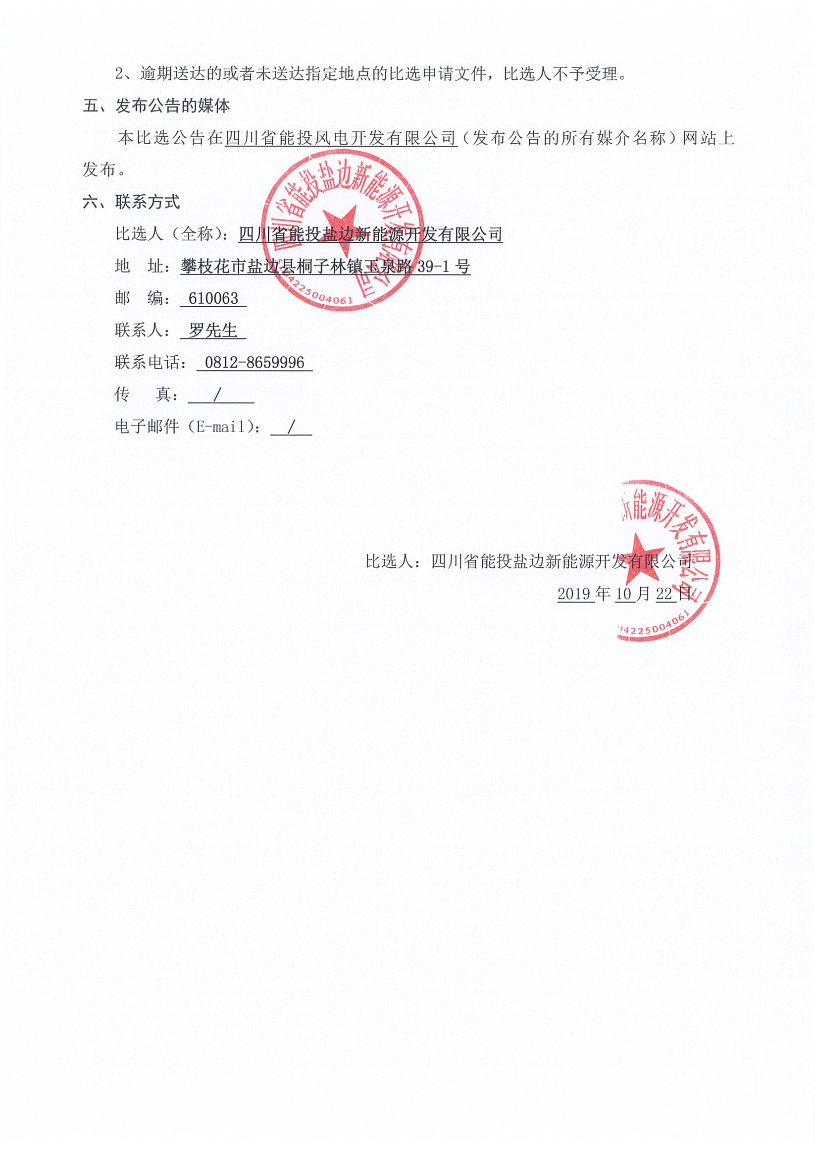 1、比选申请文件递交的截止时间(比选申请截止时间,下同)为2019年11月7日10时00分,地点为攀枝花市盐边县红格镇温泉大道133号四川省能投盐边新能源开发有限公司4楼。