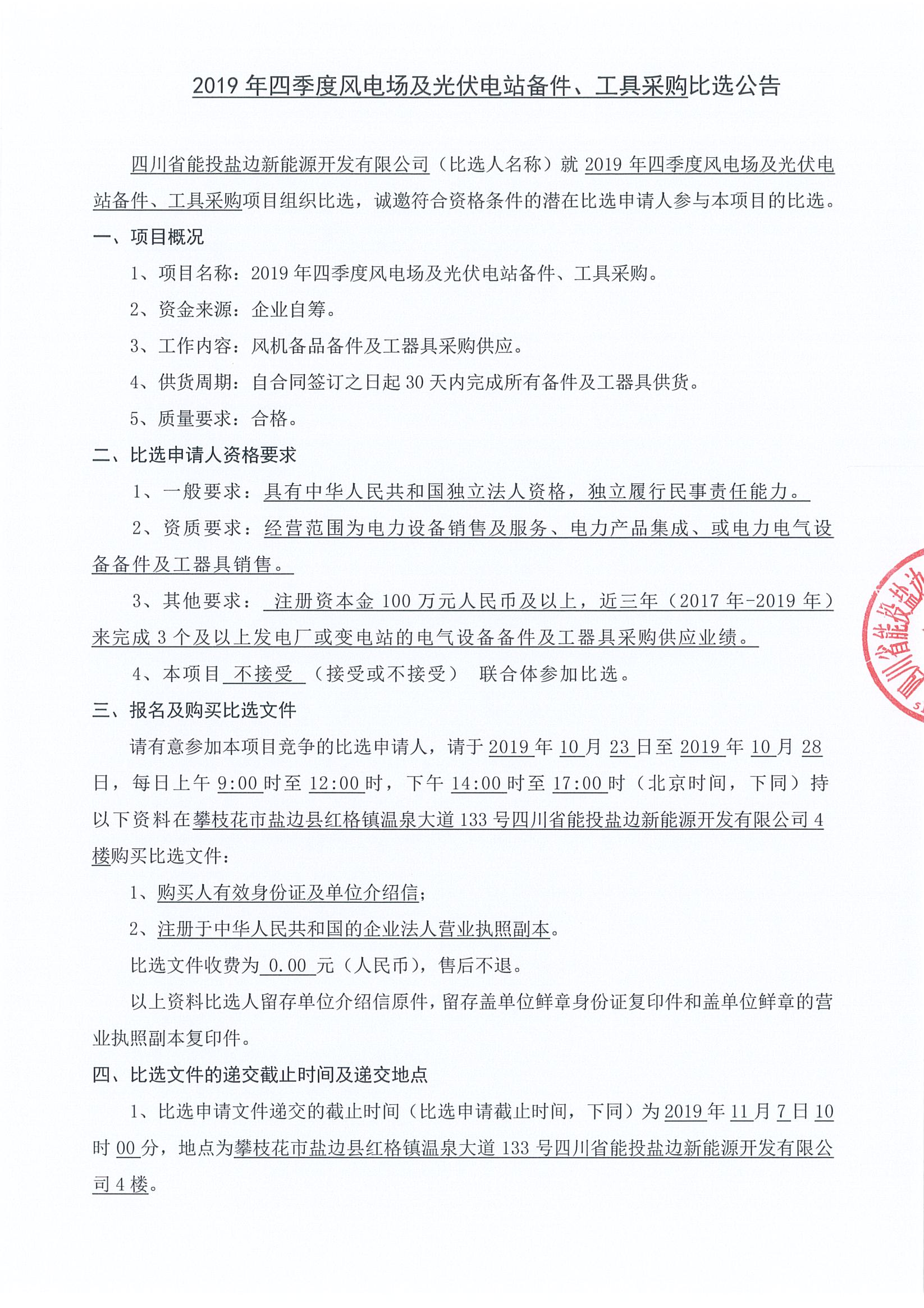 四川省能投盐边新能源开发有限公司(比选人名称)就2019年四季度风电场及光伏电站备件、工具采购项目组织比选,诚邀符合资格条件的潜在比选申请人参与本项目的比选。